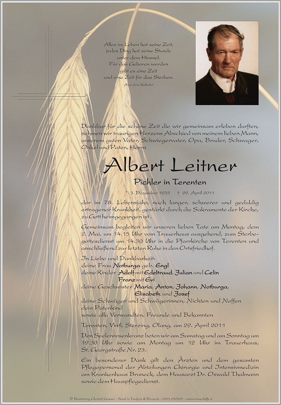 Gemeinsam begleiten wir unseren lieben Tate am Montag, dem 2. Mai, um 14.15 Uhr vom Trauerhaus ausgehend, zum Sterbegottesdienst um 14.30 Uhr in die Pfarrkirche von Terenten und anschließend zur letzten Ruhe in den Ortsfriedhof.