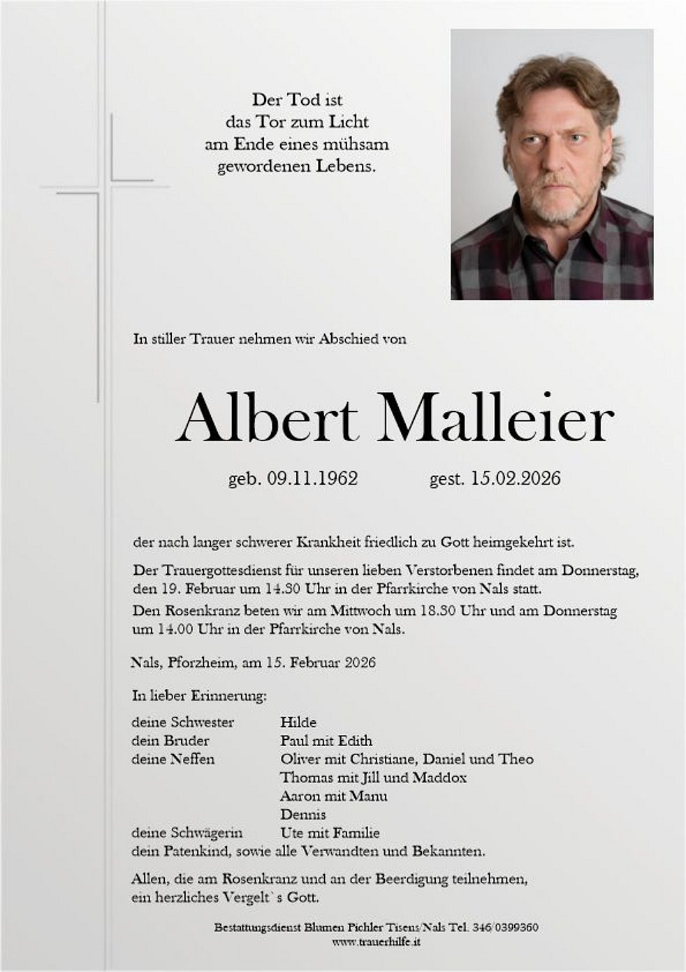 Begräbnisgottesdienst: 19.02. - 14:30 Uhr Pfarrkirche Nals