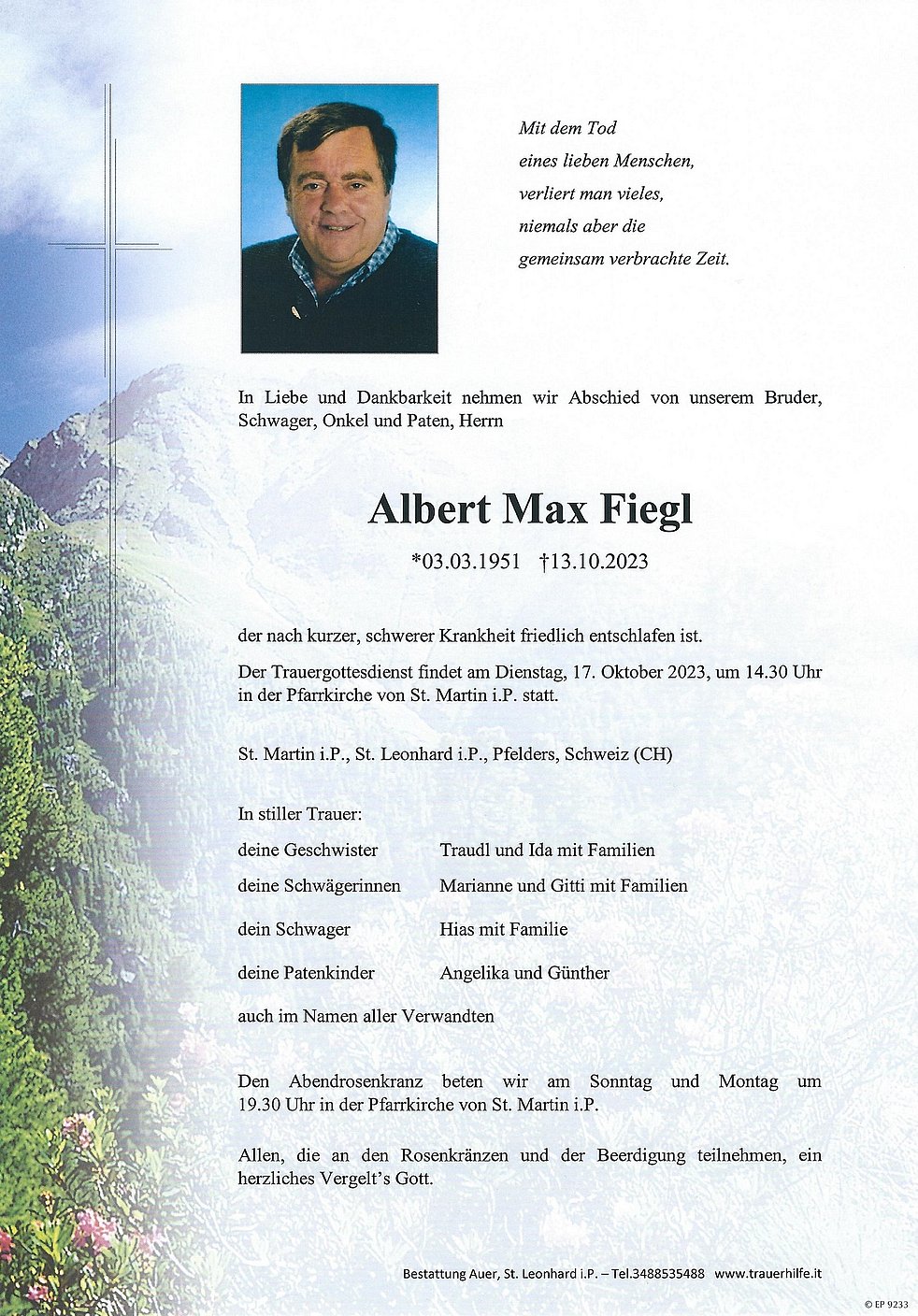 Der Trauergottesdienst findet am Dienstag, 17. Oktober 2023, um 14.30 Uhr in der Pfarrkirche von St. Martin i.P. statt.