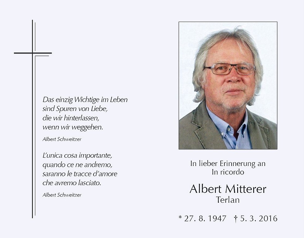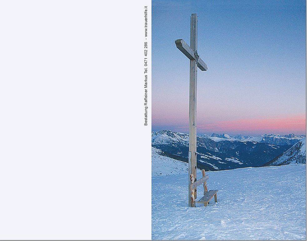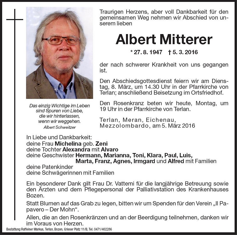 Den Abschiedsgottesdienst feiern wir am Dienstag, 8. März, um 14.30 Uhr in der Pfarrkirche von Terlan; anschließend Beisetzung im Ortsfriedhof.