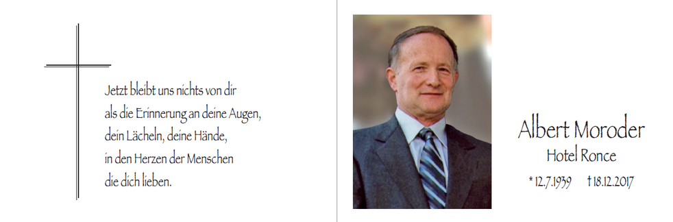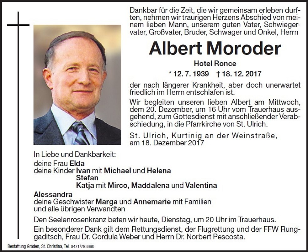 Wir begleiten unseren lieben Albert am Mittwoch, dem 20. Dezember um 16 Uhr vom Trauerhaus ausgehend zum Gottesdienst mit anschließender Verabschiedung in die Pfarrkirche von St. Ulrich.