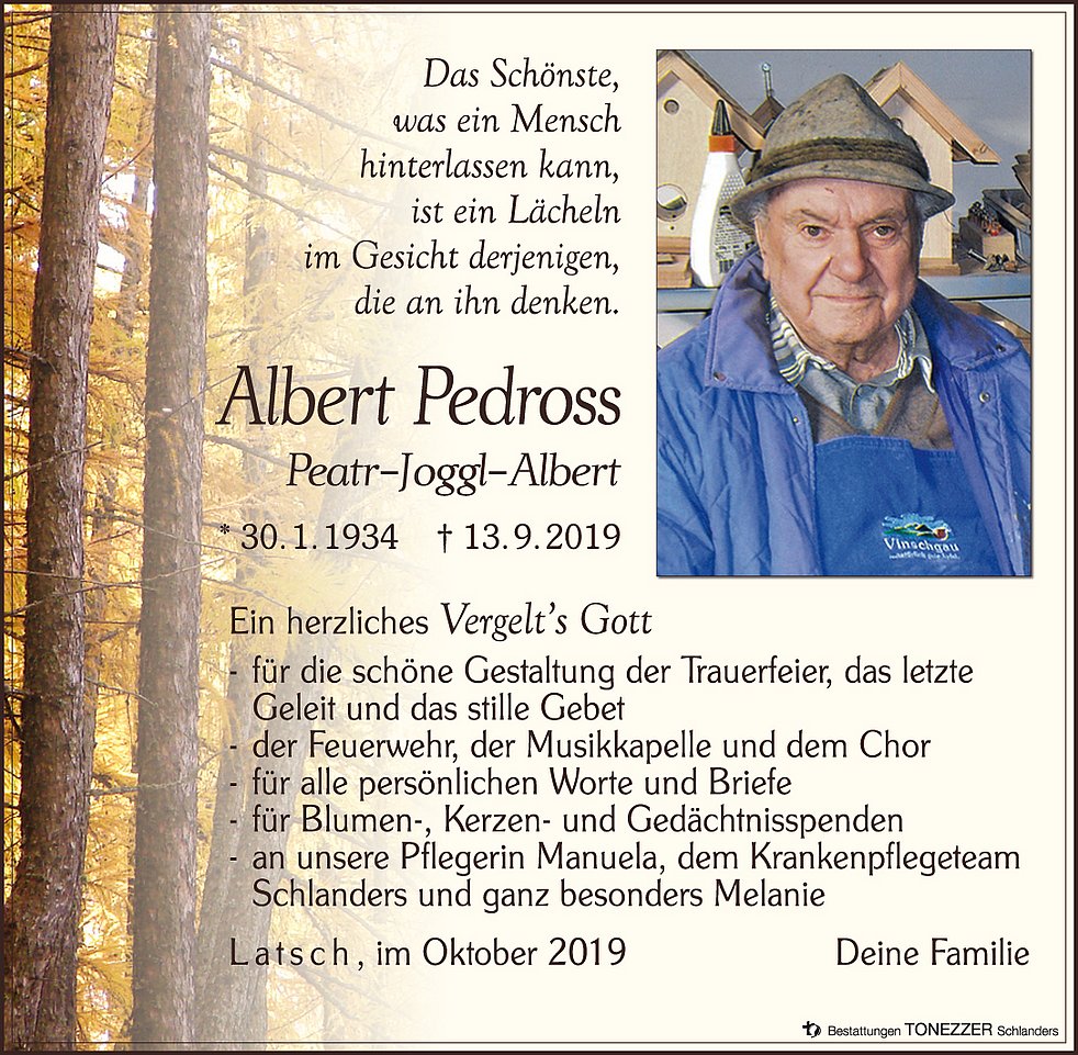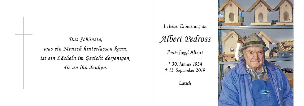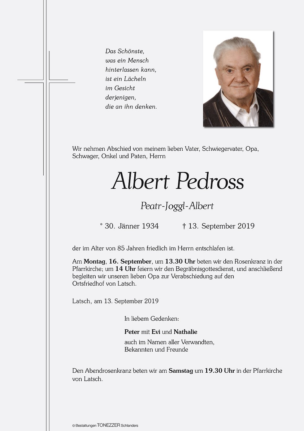 Am Montag, 16. September, um 13.30 Uhr beten wir den Rosenkranz in der Pfarrkirche; um 14 Uhr feiern wir den Begräbnisgottesdienst, und anschließend begleiten wir unseren lieben Opa zur Verabschiedung auf den Ortsfriedhof von Latsch.