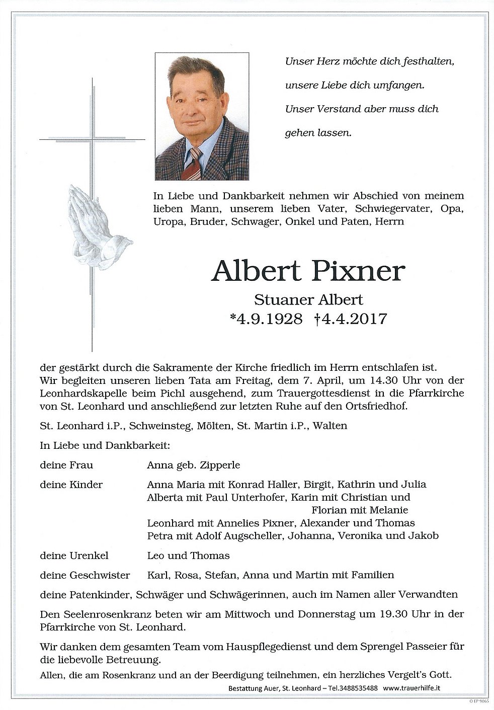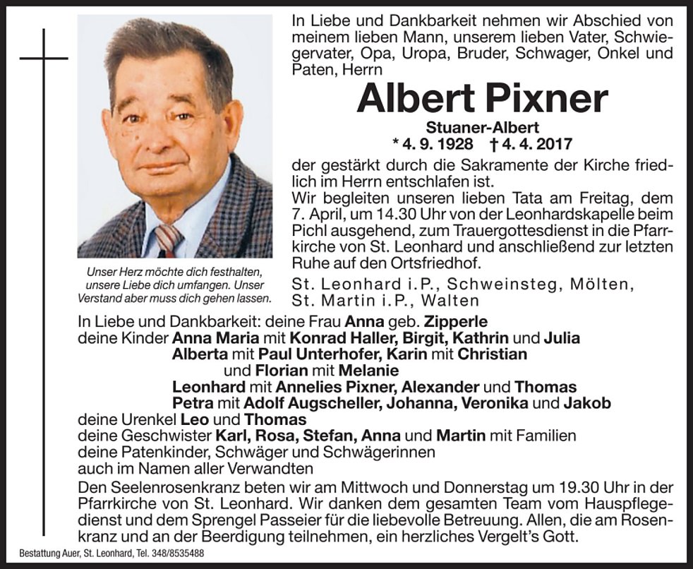 Wir begleiten unseren lieben Tata am Freitag, dem 7. April, um 14.30 Uhr von der Leonhardskapelle beim Pichl ausgehend, zum Trauergottesdienst in die Pfarrkirche von St. Leonhard und anschließend zur letzten Ruhe auf den Ortsfriedhof.