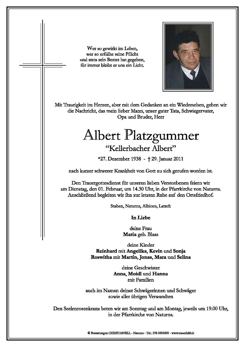 Den Trauergottesdienst für unseren lieben Verstorbenen feiern wir am Dienstag, den 01. Februar, um 14.30 Uhr, in der Pfarrkirche von Naturns. Anschließend begleiten wir ihn zur letzten Ruhe auf den Ortsfriedhof.