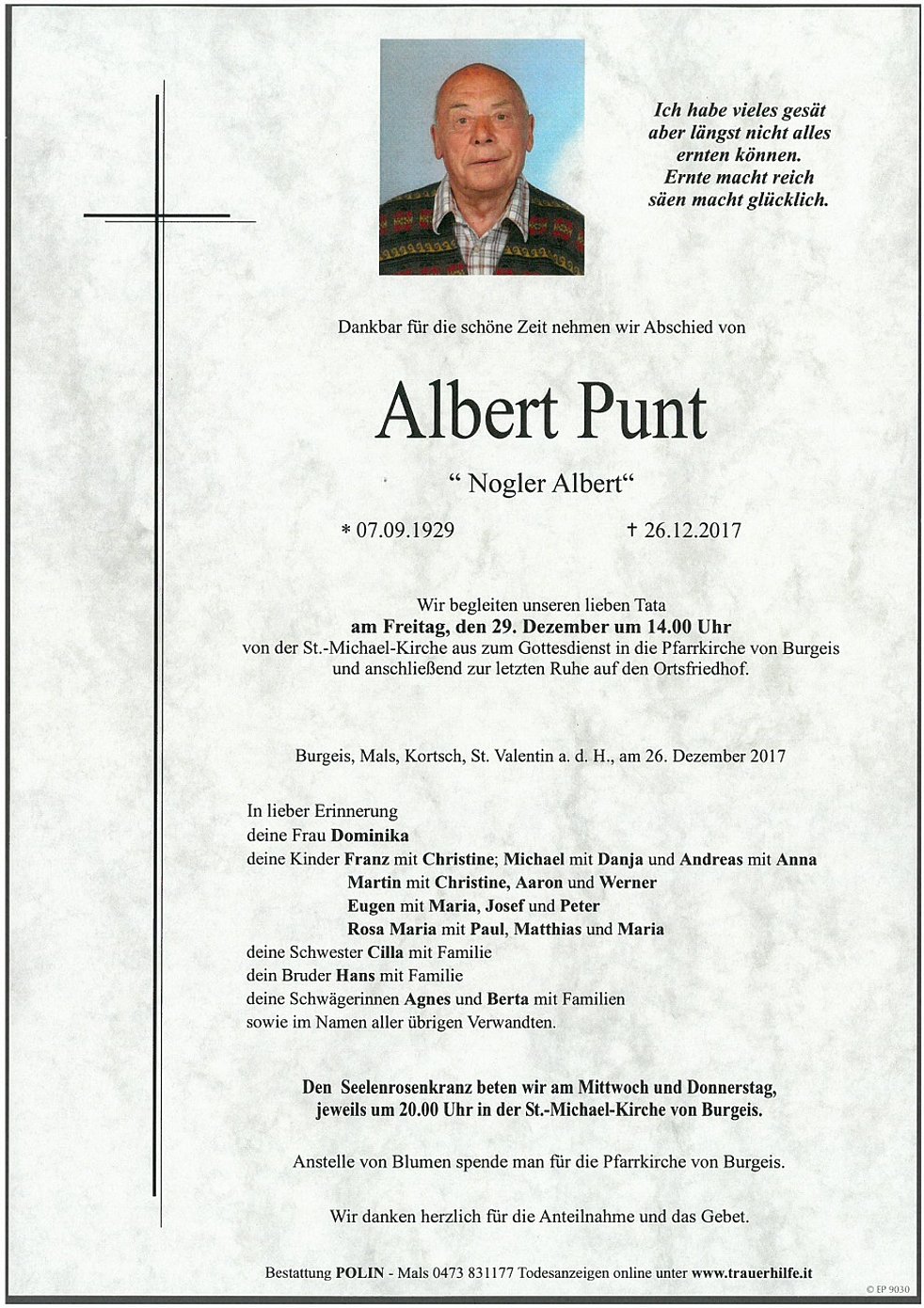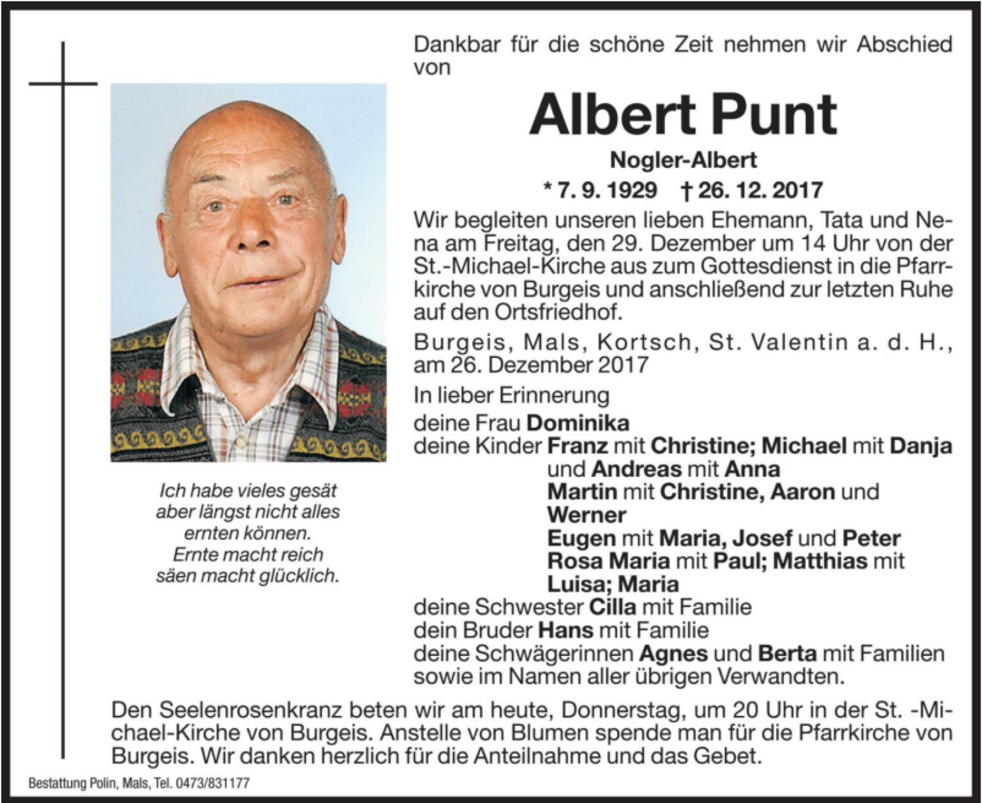 Anstelle von Blumen spende man für die Pfarrkirche von Burgeis.