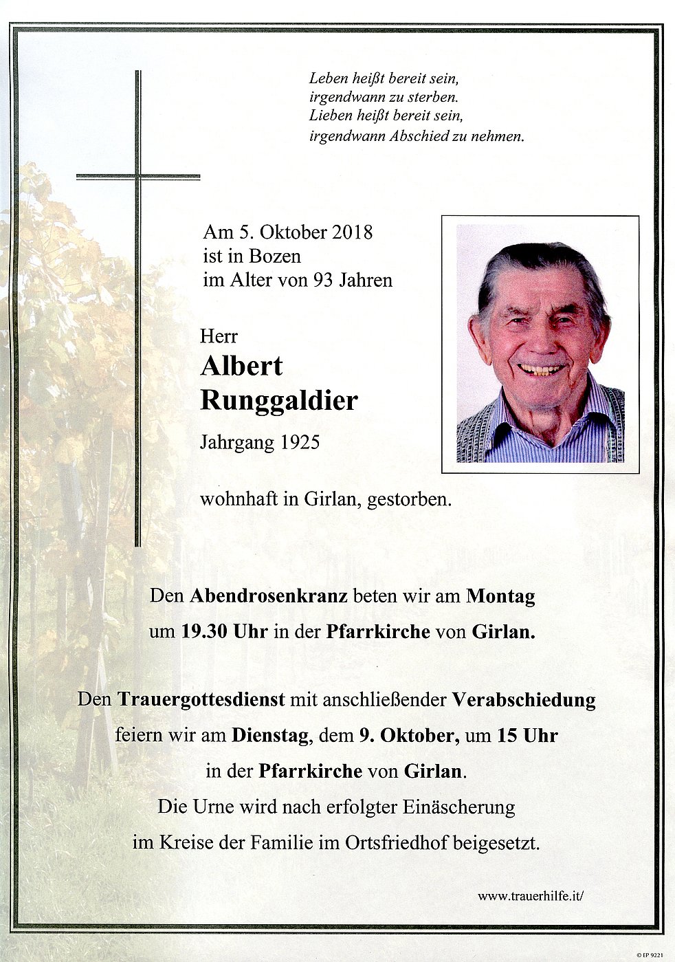 Den Trauergottesdienst mit anschließender Verabschiedung feiern wir am Dienstag dem 9. Oktober um 15 Uhr in der Pfarrkirche von Girlan. Die Urne wird nach erfolgter Einäscherung im Kreise der Familie im Ortsfriedhof beigesetzt.