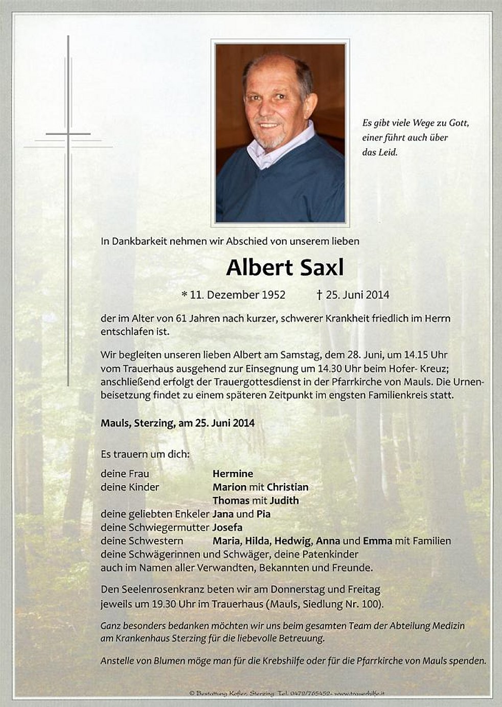 Anstelle von Blumen möge man für die Krebshilfe oder für die Pfarrkirche von Mauls spenden.
