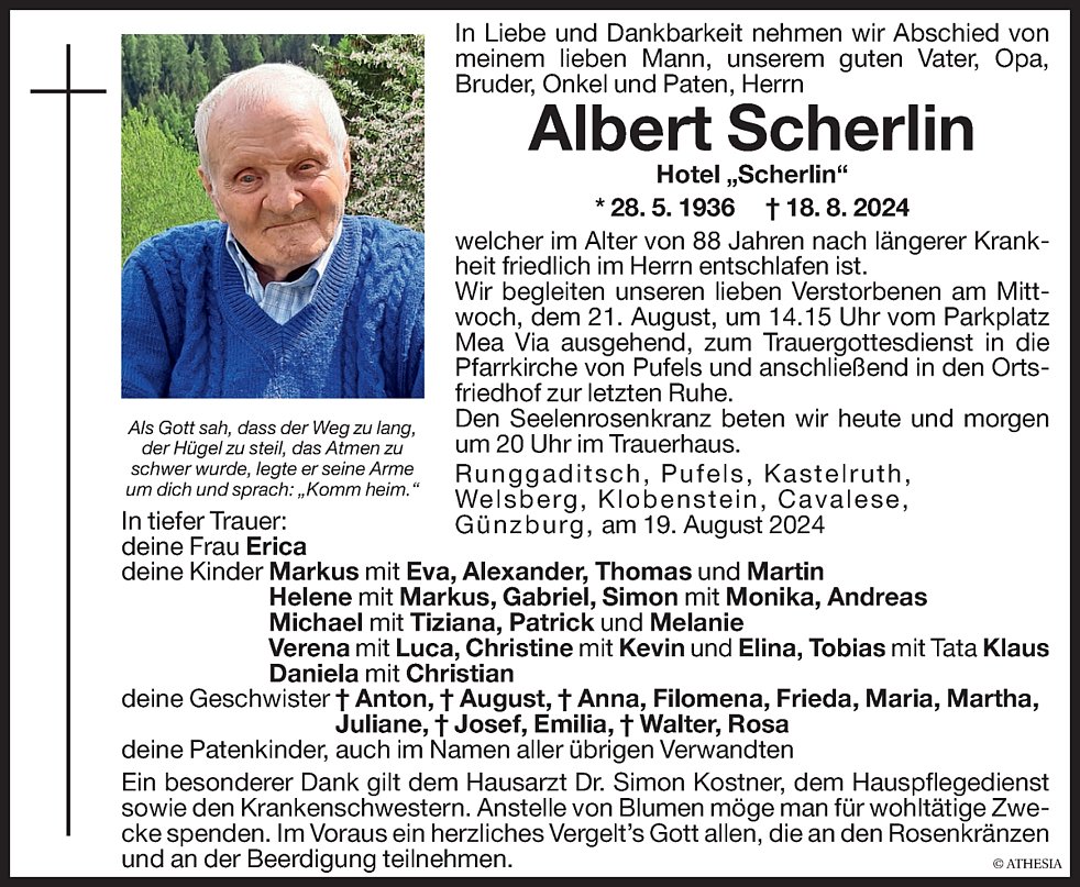 Wir begleiten unseren lieben Verstorbenen am Mittwoch, dem 21. August, um 14.15 Uhr vom Parkplatz Mea Via ausgehend, zum Trauergottesdienst in die Pfarrkirche von Pufels und anschließend in den Ortsfriedhof zur letzten Ruhe.