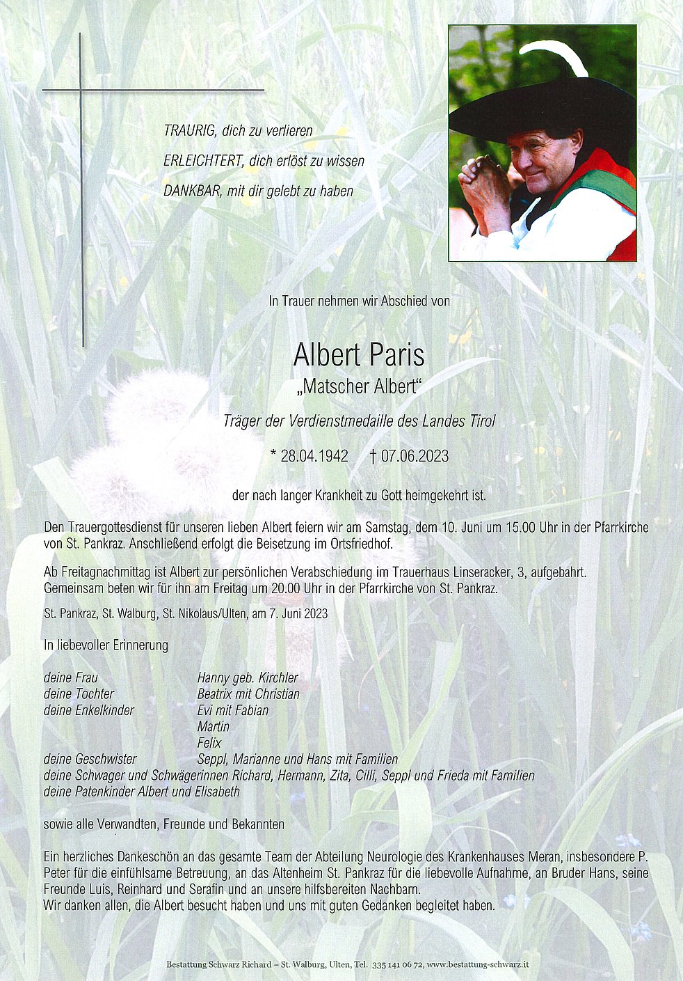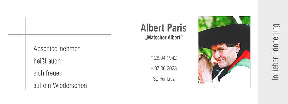 Den Trauergottesdienst für unseren lieben Albert feiern wir am Samstag, dem 10. Juni um 15.00 Uhr in der Pfarrkirche von St. Pankraz.