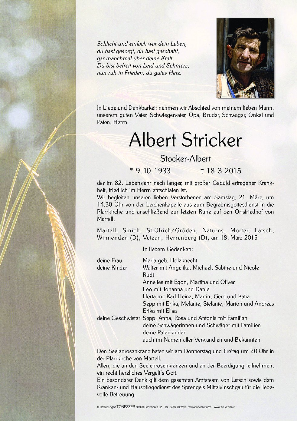 Wir begleiten unseren lieben Verstorbenen am Samstag, 21. März, um 14.30 Uhr von der Leichenkapelle aus zum Begräbnisgottesdienst in die Pfarrkirche und anschließend zur letzten Ruhe auf den Ortsfriedhof von Martell.