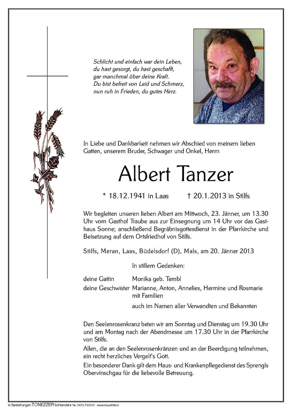Wir begleiten unseren lieben Albert am Mittwoch, 23. Jänner, um 13.30 Uhr vom Gasthof Traube aus zur Einsegnung um 14 Uhr vor das Gasthaus Sonne; anschließend Begräbnisgottesdienst in der Pfarrkirche und Beisetzung auf dem Ortsfriedhof von Stilfs.