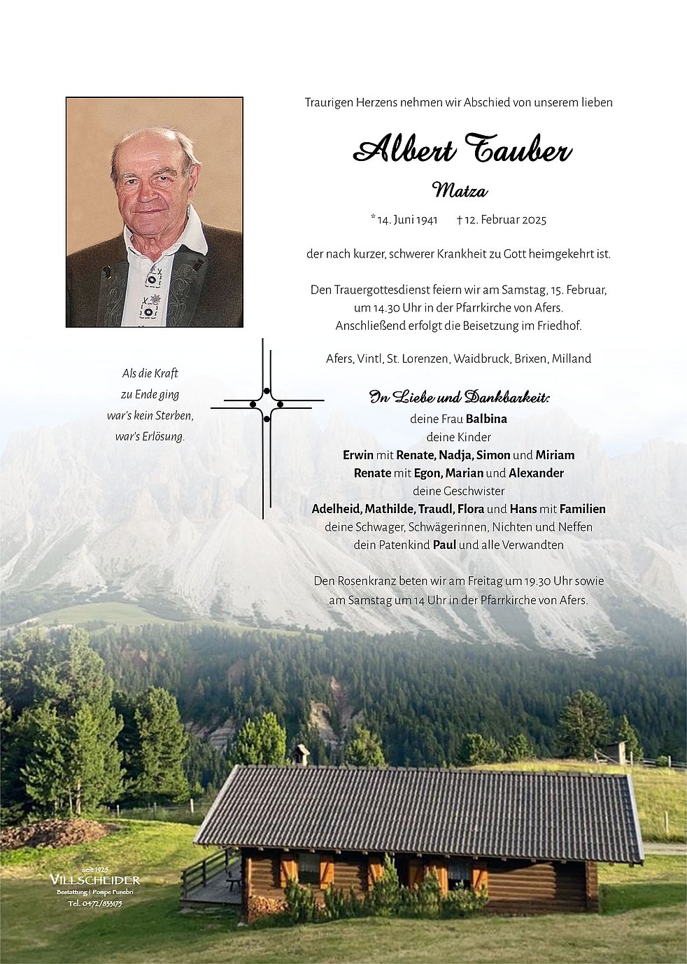 Begräbnisgottesdienst: 15.02. - 14:30 Uhr Afers