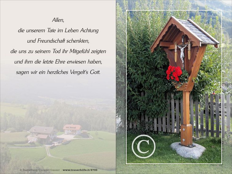 Gemeinsam begleiten wir unseren lieben Tate am Dienstag, dem 15. November, um 13 Uhr vom Heimathaus ausgehend, zum Abschiedsgottesdienst um 14 Uhr in die Pfarrkirche von Reischach. Anschließend übergeben wir ihn der geweihten Erde.