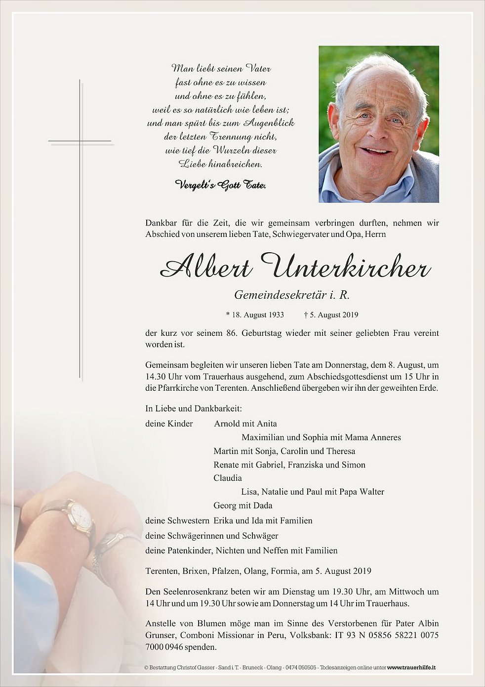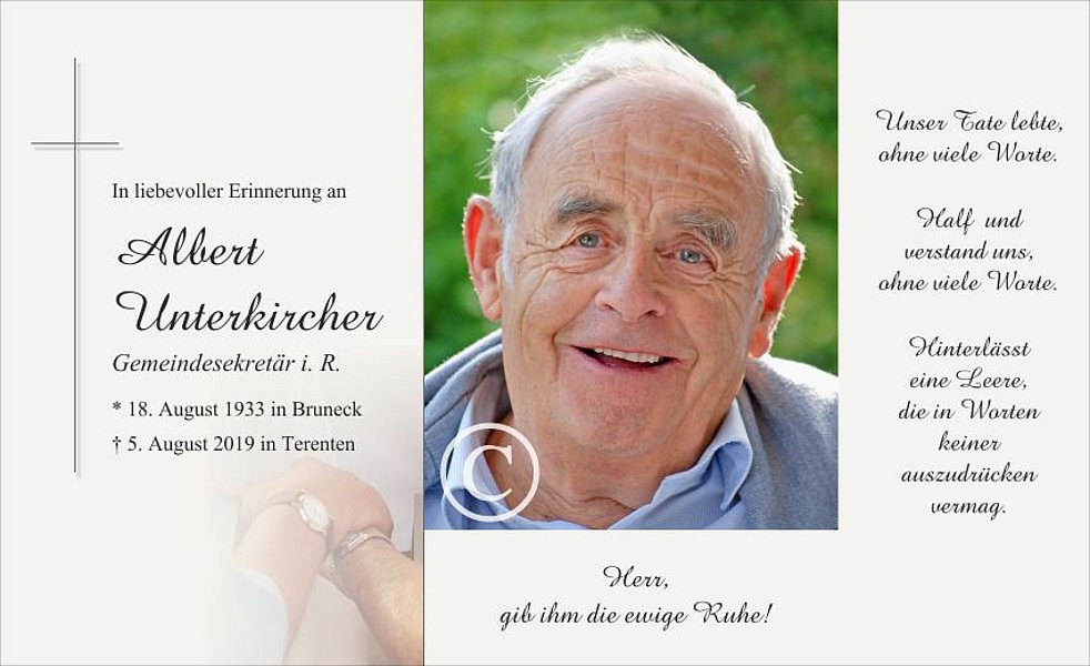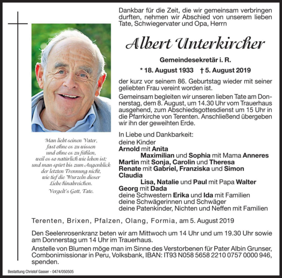Anstelle von Blumen möge man im Sinne des Verstorbenen für Pater Albin Grunser, Comboni Missionar in Peru, Volksbank: IT 93 N 05856 58221 0075 7000 0946 spenden.