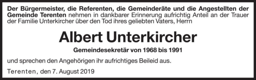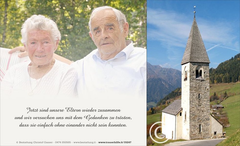 Gemeinsam begleiten wir unseren lieben Tate am Donnerstag, dem 8. August, um 14.30 Uhr vom Trauerhaus ausgehend, zum Abschiedsgottesdienst um 15 Uhr in die Pfarrkirche von Terenten. Anschließend übergeben wir ihn der geweihten Erde.