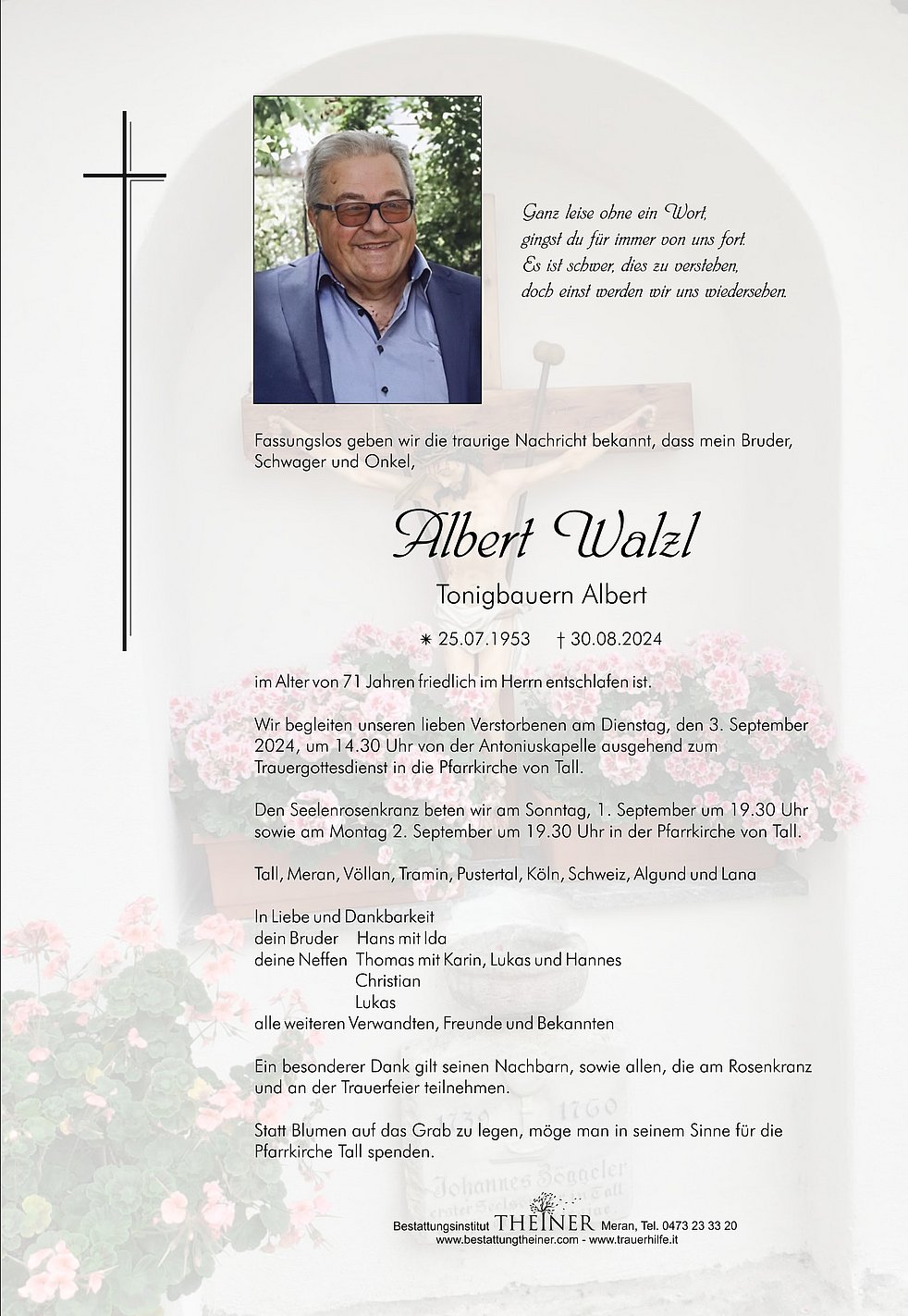 Wir begleiten unseren lieben Verstorbenen am Dienstag, den 3. September 2024, um 14.30 Uhr von der Antoniuskapelle ausgehend zum Trauergottesdienst in die Pfarrkirche von Tall.