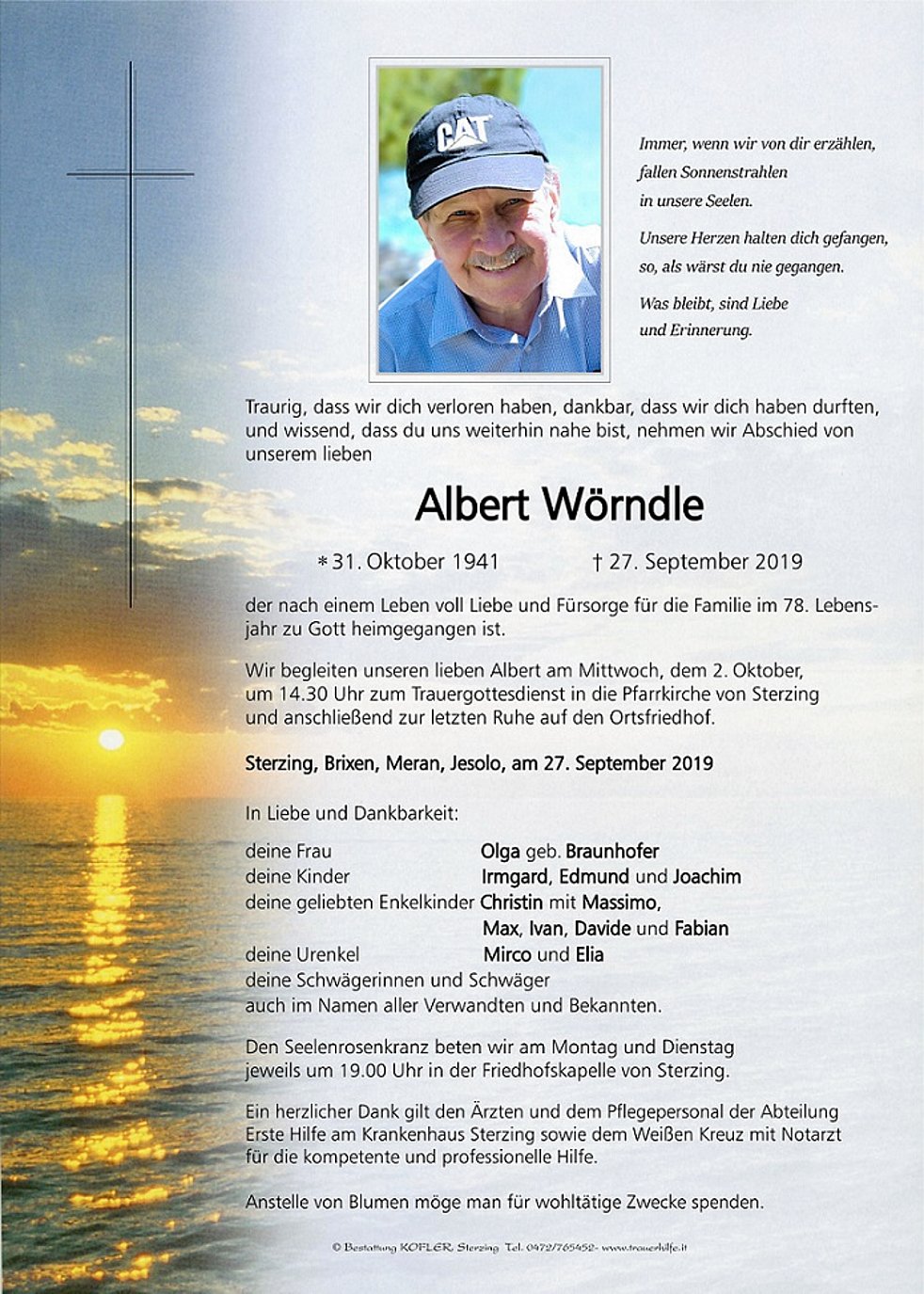 Wir begleiten unseren lieben Albert am Mittwoch, dem 2. Oktober, um 14.30 Uhr zum Trauergottesdienst in die Pfarrkirche von Sterzing und anschließend zur letzten Ruhe auf den Ortsfriedhof.