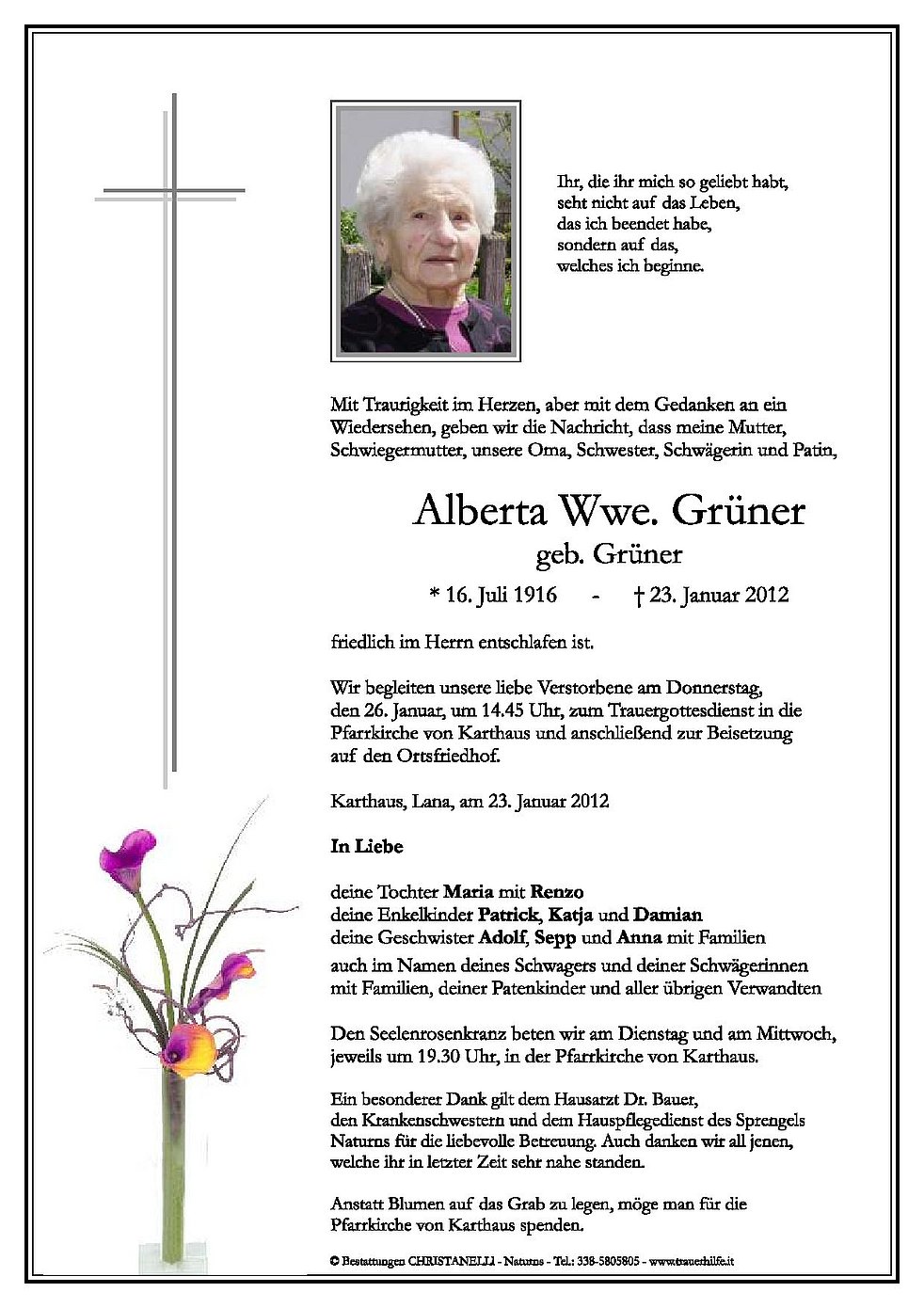 Wir begleiten unsere liebe Verstorbene am Donnerstag, den 26. Januar, um 14.45 Uhr, zum Trauergottesdienst in die Pfarrkirche von Karthaus und anschließend zur Beisetzung auf den Ortsfriedhof.