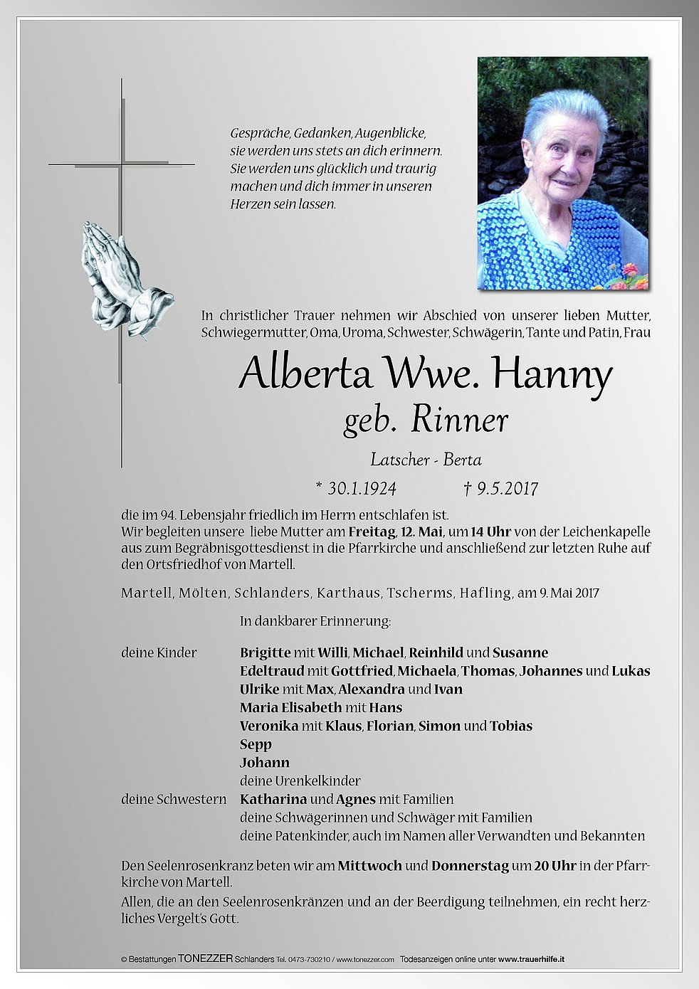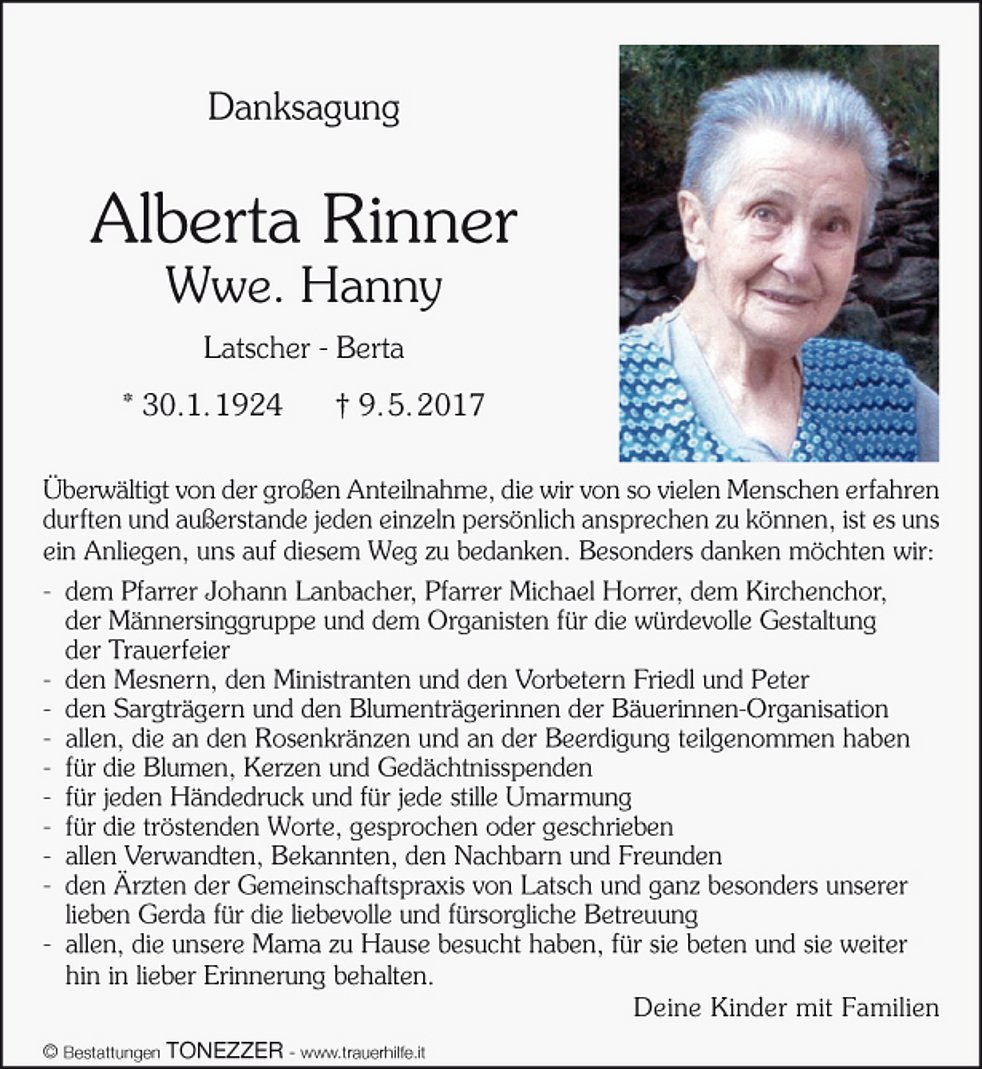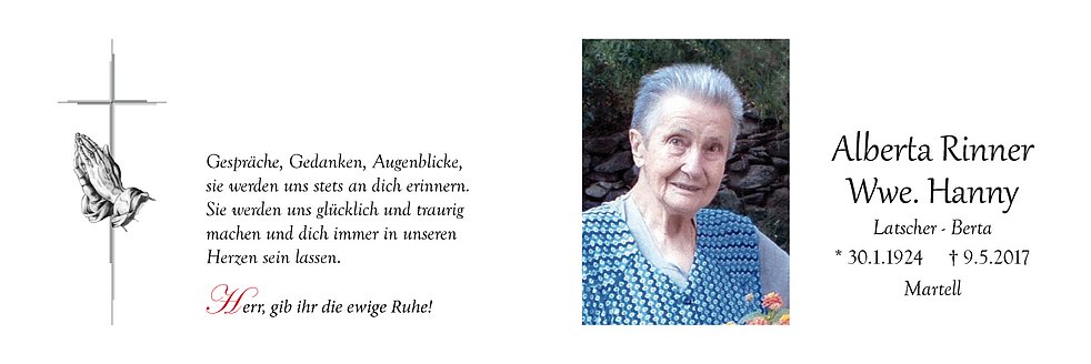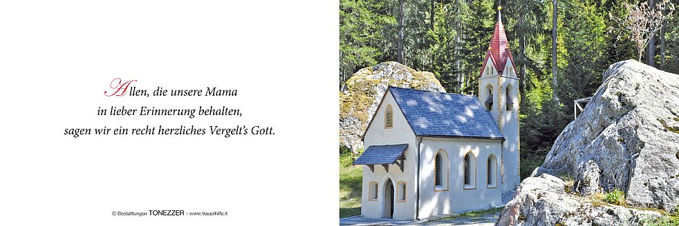 Wir begleiten unsere liebe Mutter am Freitag, 12. Mai, um 14 Uhr von der Leichenkapelle aus zum Begräbnisgottesdienst in die Pfarrkirche und anschließend zur letzten Ruhe auf den Ortsfriedhof von Martell.