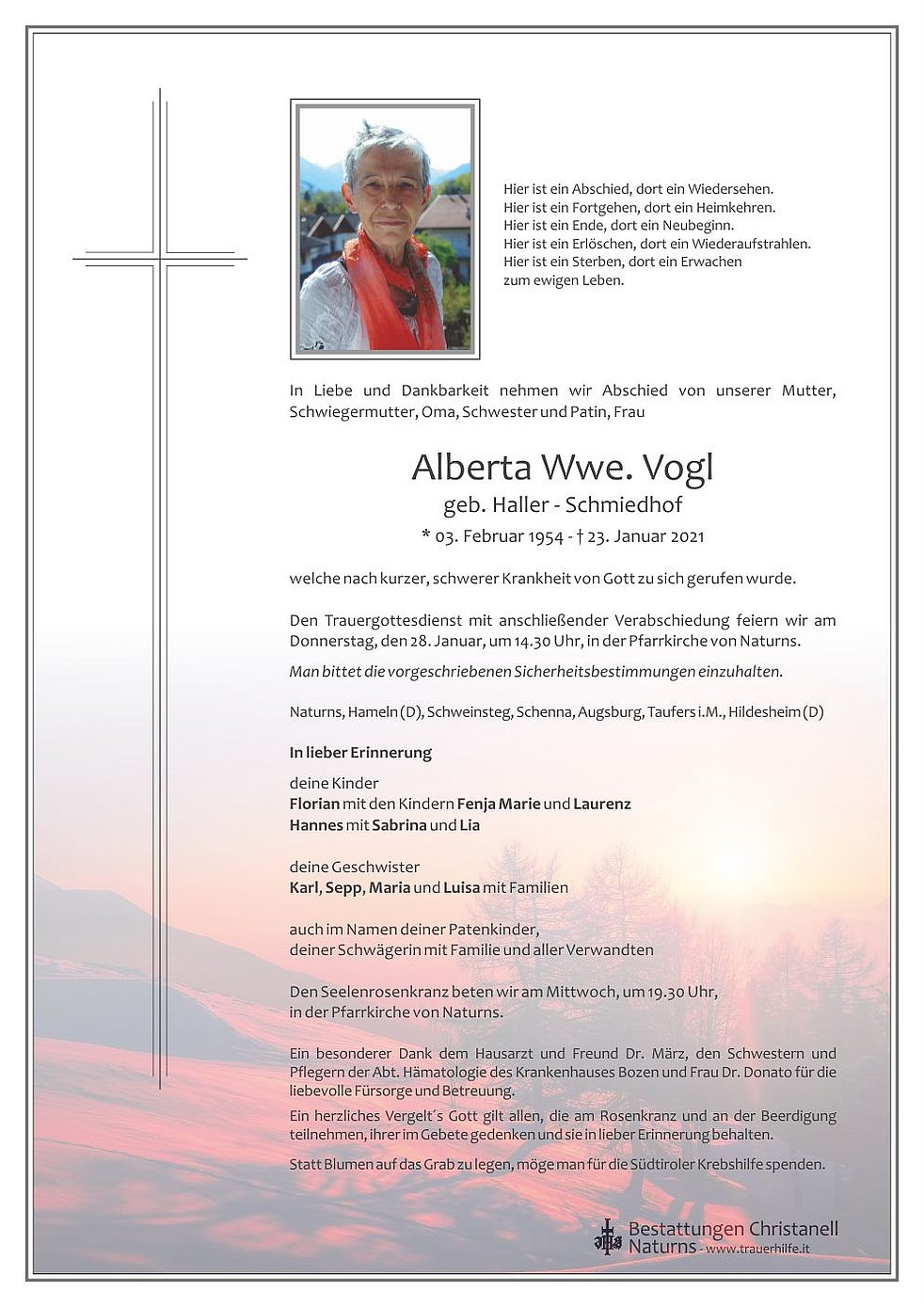Den Trauergottesdienst mit anschließender Verabschiedung feiern wir am Donnerstag, den 28. Januar, um 14.30 Uhr, in der Pfarrkirche von Naturns.