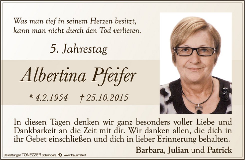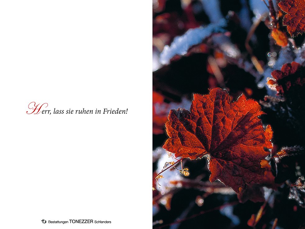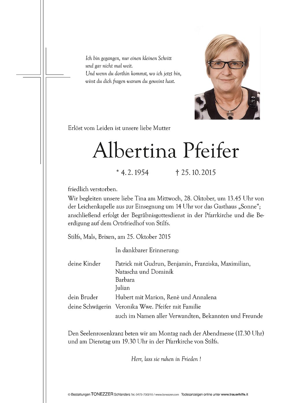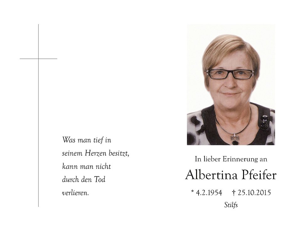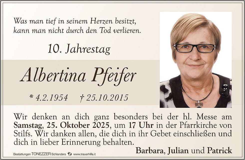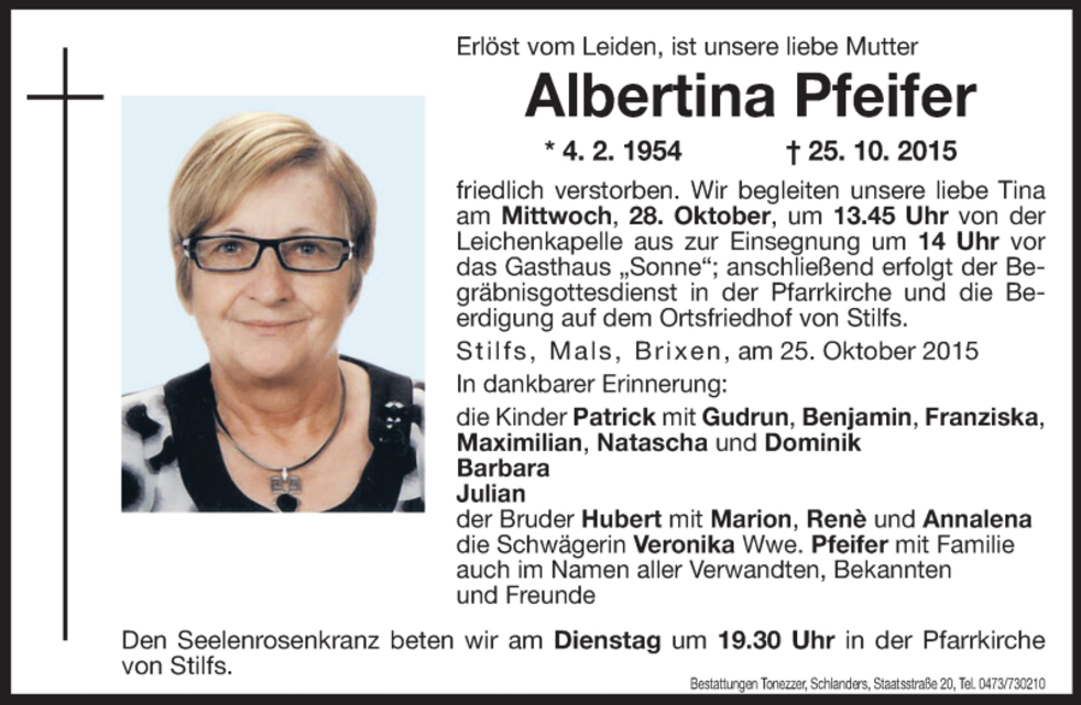 Wir begleiten unsere liebe Tina am Mittwoch, 28. Oktober, um 13.45 Uhr von der Leichenkapelle aus zur Einsegnung um 14 Uhr vor das Gasthaus „Sonne“; anschließend erfolgt der Begräbnisgottesdienst in der Pfarrkirche und die Beerdigung auf dem Ortsfriedhof von Stilfs.