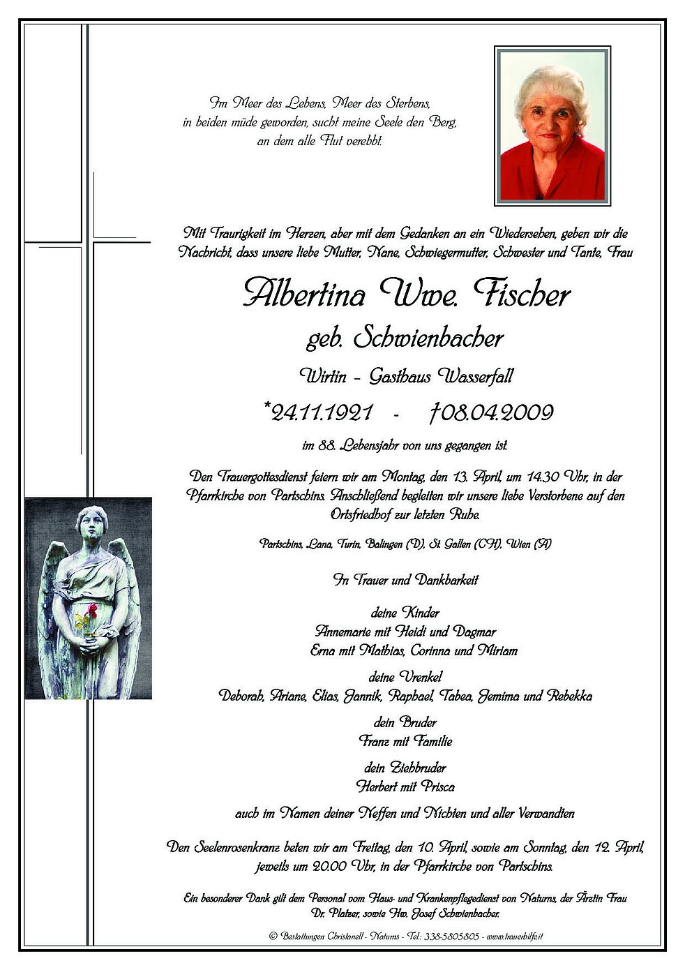 Den Trauergottesdienst feiern wir am Montag, den 13. April, um 14.30 Uhr, in der Pfarrkirche von Partschins. Anschließend begleiten wir unsere liebe Verstorbene auf den Ortsfriedhof zur letzten Ruhe.