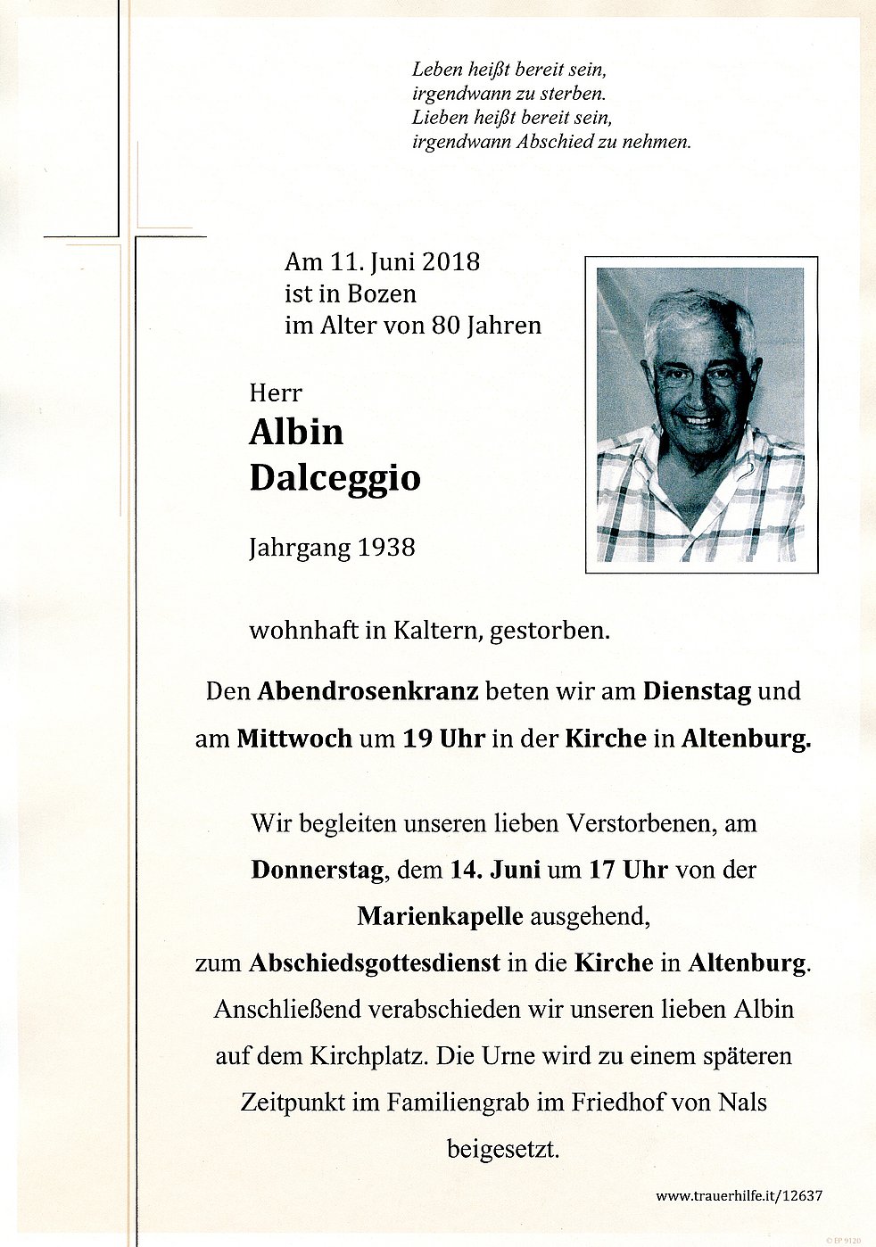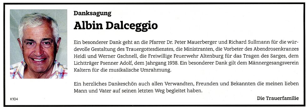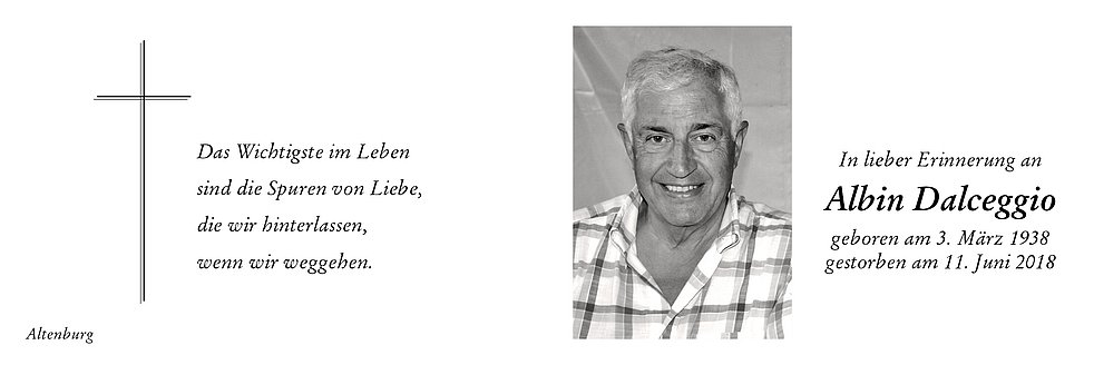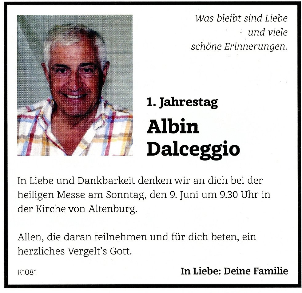 Wir begleiten unseren lieben Verstorbenen, am Donnerstag, dem 14. Juni um 17 Uhr von der Marienkapelle ausgehend, zum Abschiedsgottesdienst in die Kirche in Altenburg. Anschließend verabschieden wir unseren lieben Albin auf dem Kirchplatz.