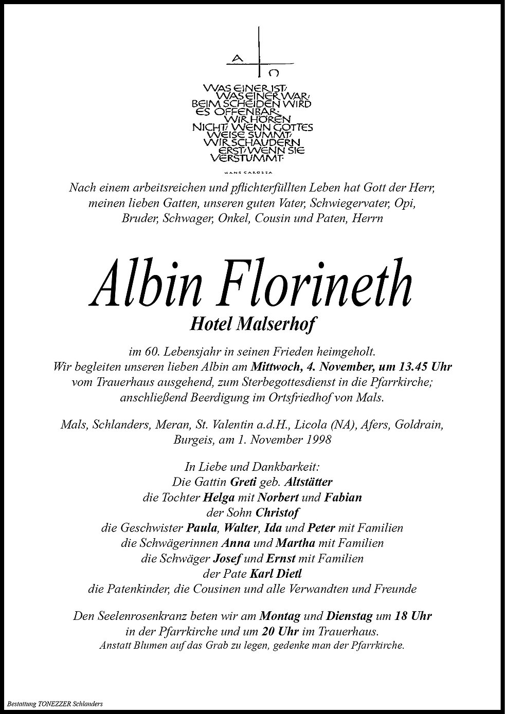 In lieber Erinnerung an die Zeit im Malser Hof. Ruhe in Frieden
