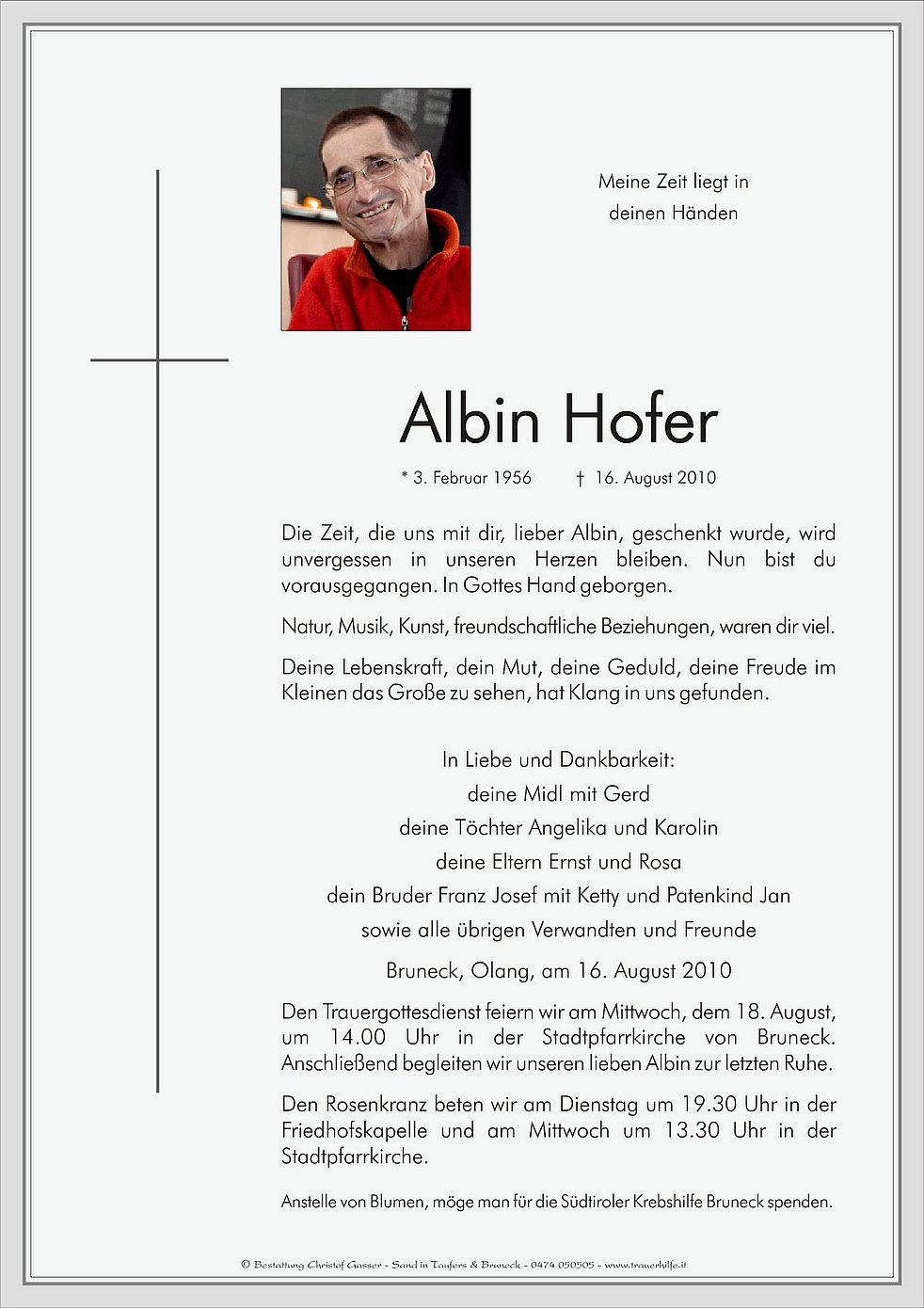 Den Trauergottesdienst feiern wir am Mittwoch, dem 18. August, um 14.00 Uhr in der Stadtpfarrkirche von Bruneck. Anschließend begleiten wir unseren lieben Albin zur letzten Ruhe.
