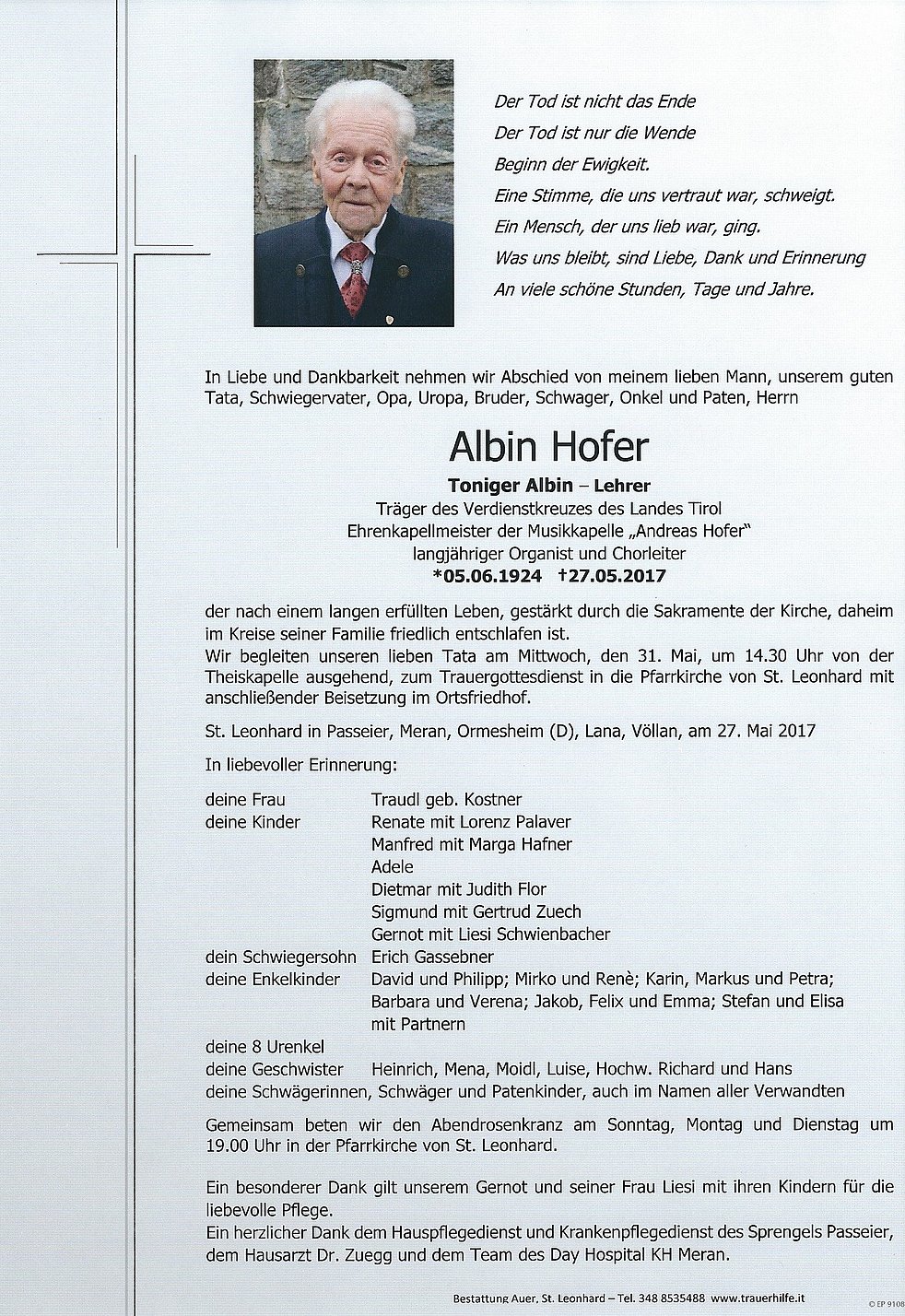 Wir begleiten unseren lieben Tata am Mittwoch, den 31. Mai, um 14.30 Uhr von der Theiskapelle ausgehend, zum Trauergottesdienst in die Pfarrkirche von St. Leonhard mit anschließender Beisetzung im Ortsfriedhof.