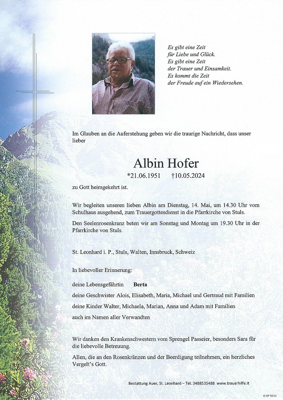 Wir begleiten unseren lieben Albin am Dienstag, 14. Mai, um 14.30 Uhr vom Schulhaus ausgehend, zum Trauergottesdienst in die Pfarrkirche von Stuls.