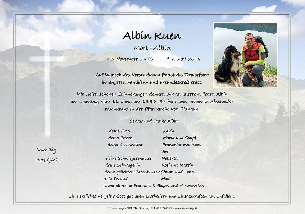 Mit vielen schönen Erinnerungen denken wir an unserem lieben Albin am Dienstag, dem 11. Juni, um 19.30 Uhr beim gemeinsamen Abschiedsrosenkranz in der Pfarrkirche von Ridnaun.