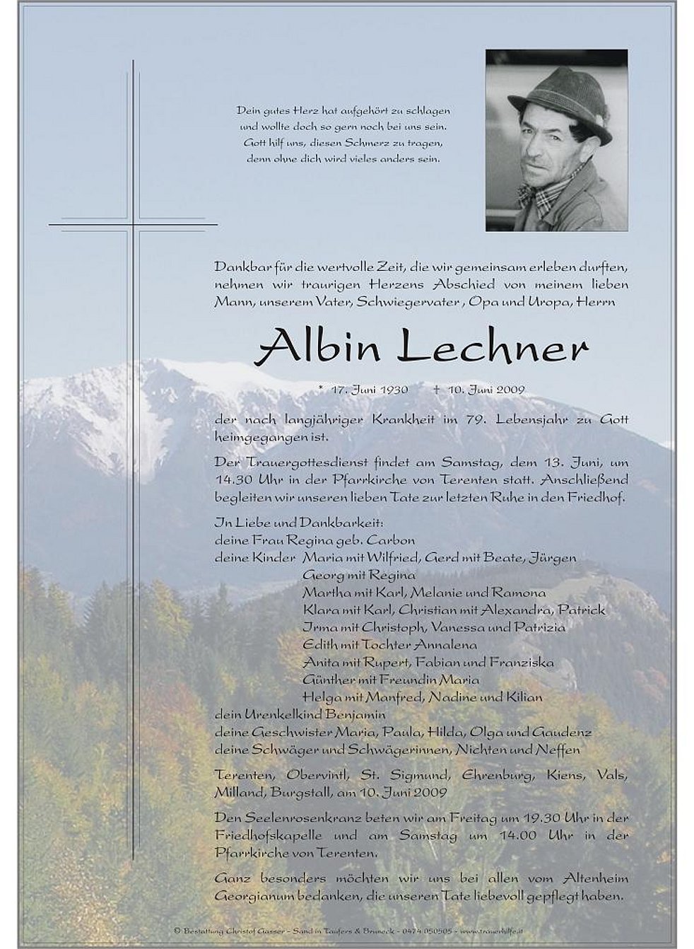 Der Trauergottesdienst findet am Samstag, dem 13. Juni, um 14.30 Uhr in der Pfarrkirche von Terenten statt. Anschließend begleiten wir unseren lieben Tate zur letzten Ruhe in den Friedhof.