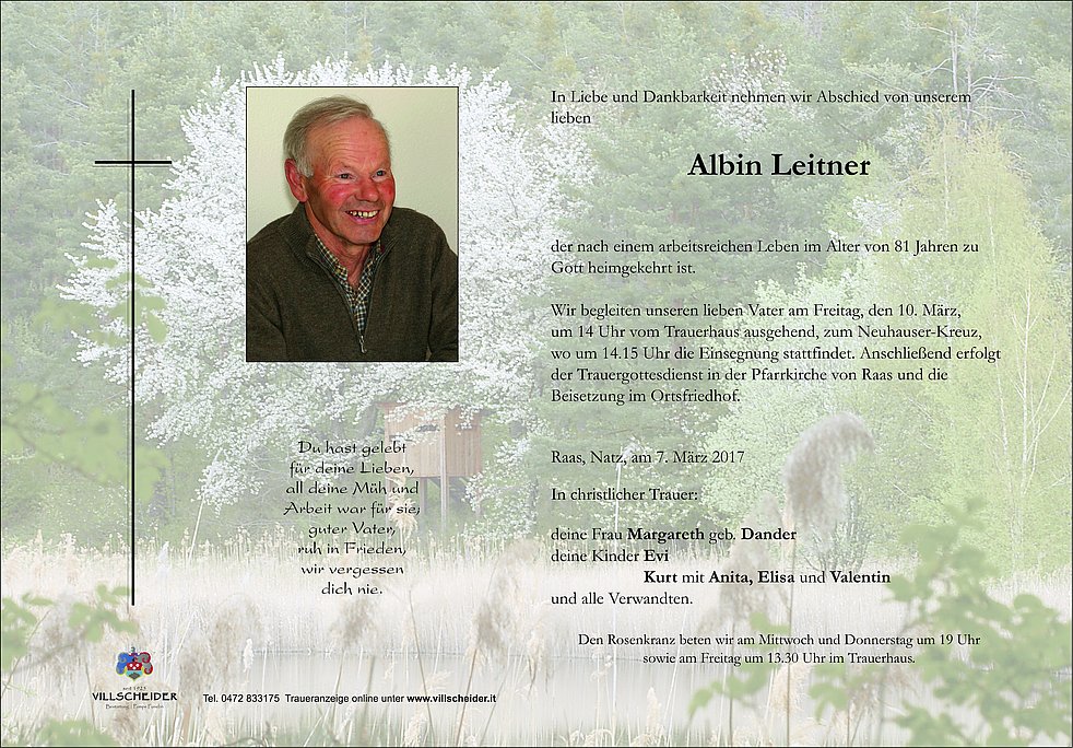 wo um 14.15 Uhr die Einsegnung stattfindet. Anschließend erfolgt der Trauergottesdienst in der Pfarrkirche von Raas und die Beisetzung im Ortsfriedhof.