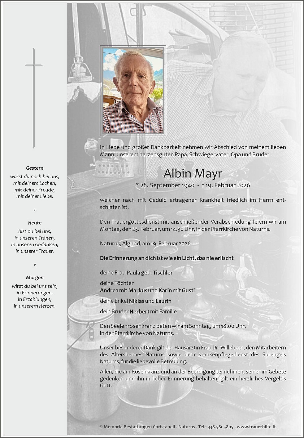 Den Trauergottesdienst mit anschließender Verabschiedung feiern wir am Montag, den 23. Februar, um 14.30 Uhr, in der Pfarrkirche von Naturns.