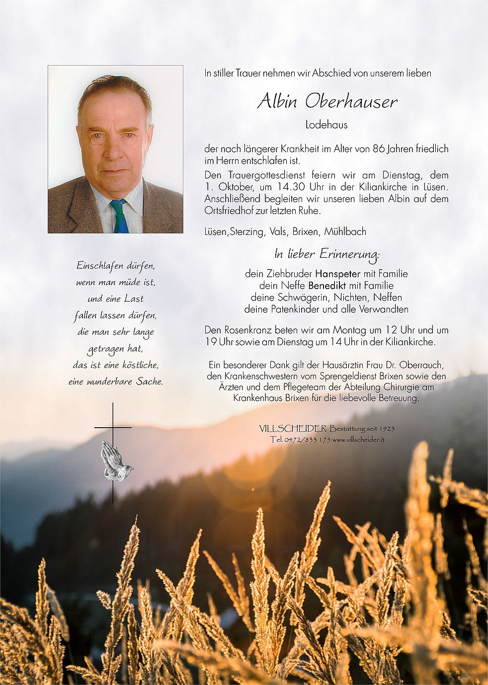 Begräbnisgottesdienst: 02.10. - 14:30 Uhr Kiliankirche Lüsen