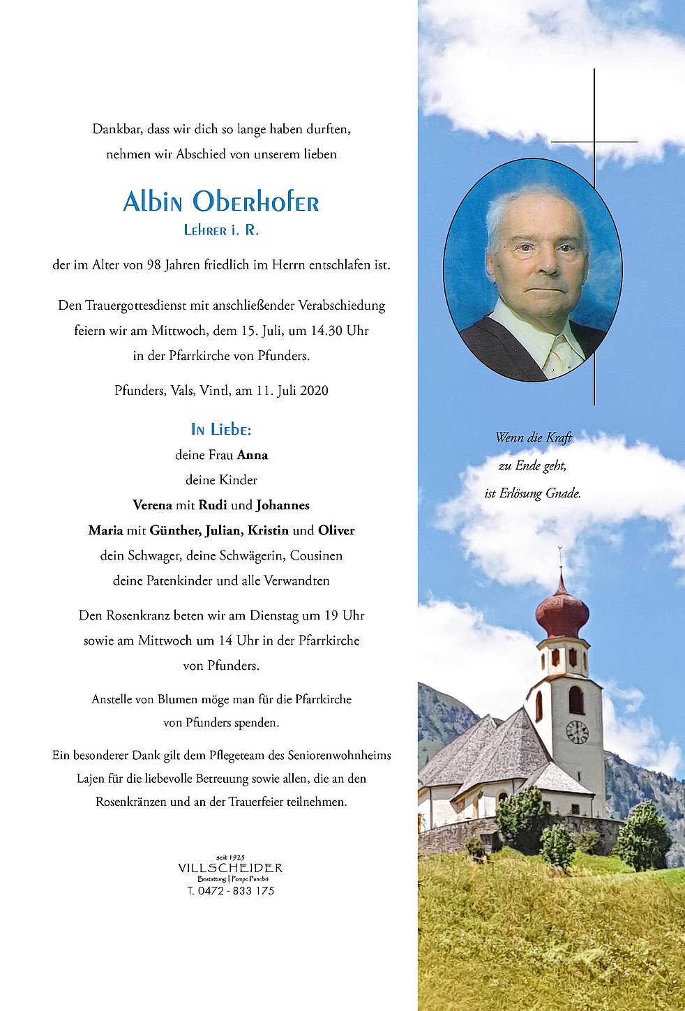 Trauerfeier: 15.07. - 14:30 Uhr Pfunders