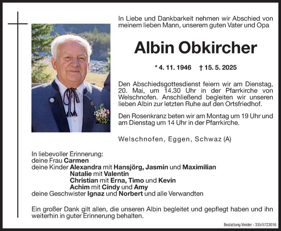 Den Abschiedsgottesdienst feiern wir am Dienstag, 20. Mai, um 14.30 Uhr in der Pfarrkirche von Welschnofen. Anschließend begleiten wir unseren lieben Albin zur letzten Ruhe auf den Ortsfriedhof.