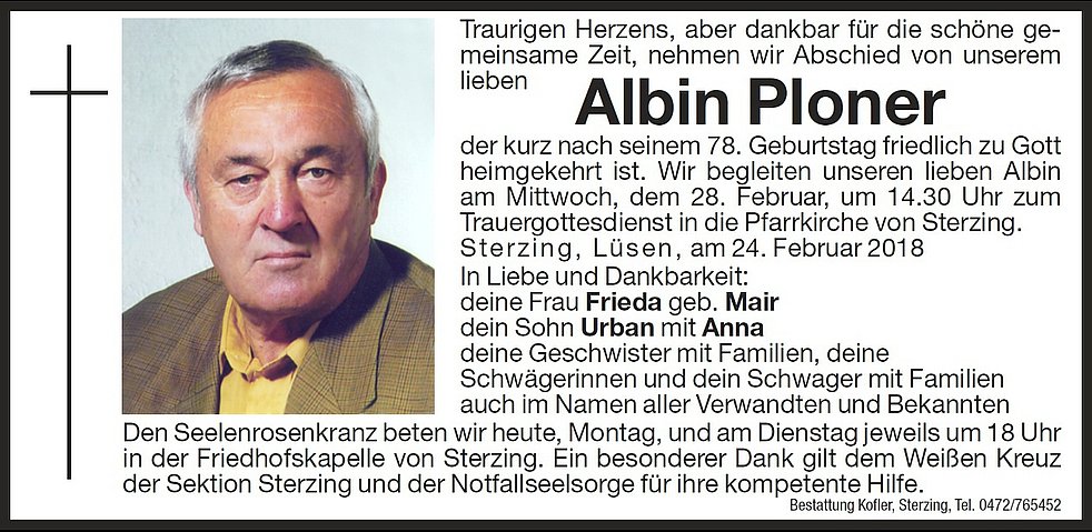 Wir begleiten unseren lieben Albin am Mittwoch, dem 28. Februar, um 14.30 Uhr zum Trauergottesdienst in die Pfarrkirche von Sterzing und anschließend zur letzten Ruhe auf den Ortsfriedhof.
