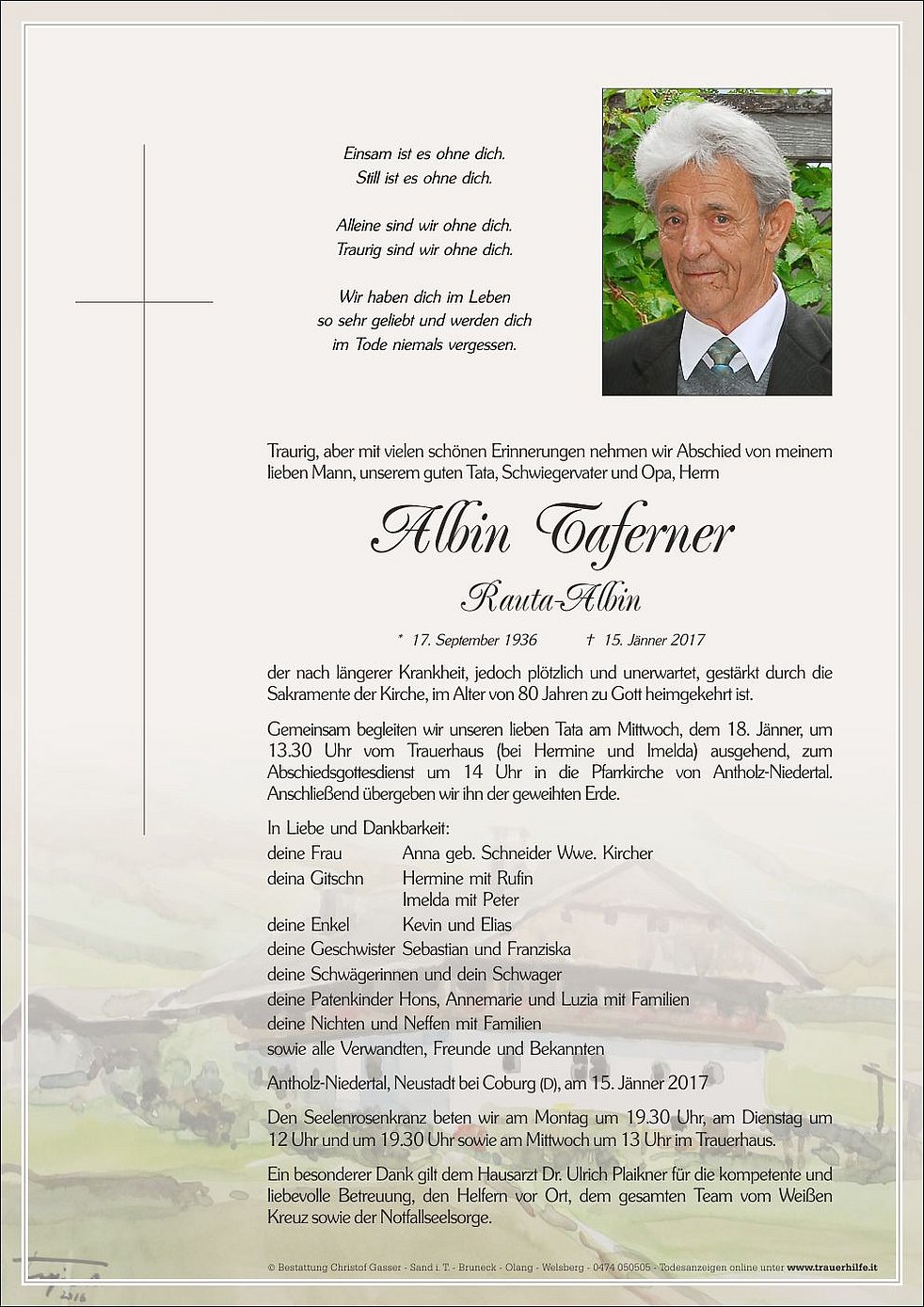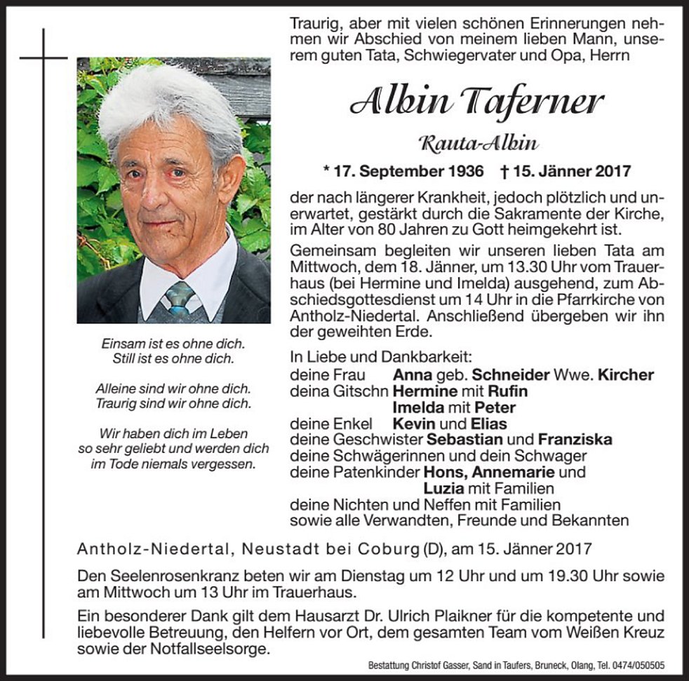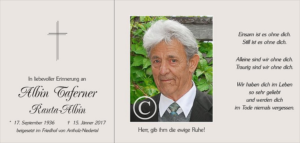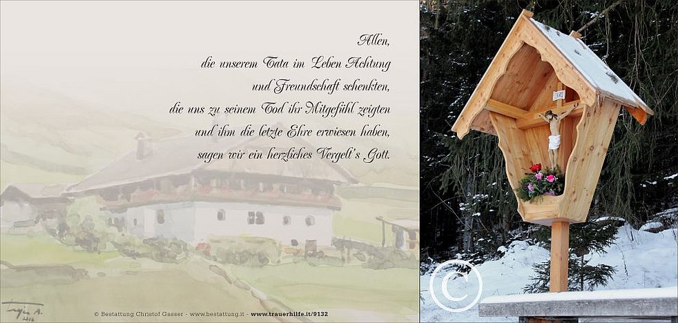 Gemeinsam begleiten wir unseren lieben Tata am Mittwoch, dem 18. Jänner, um 13.30 Uhr vom Trauerhaus (bei Hermine und Imelda) ausgehend, zum Abschiedsgottesdienst um 14 Uhr in die Pfarrkirche von Antholz-Niedertal. Anschließend übergeben wir ihn der geweihten Erde.