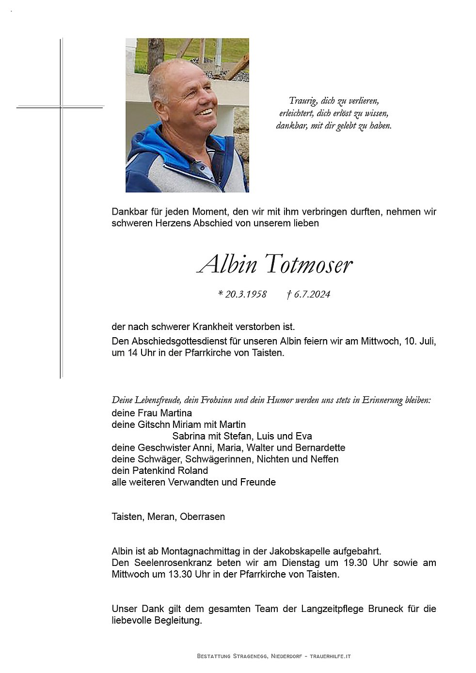 Albin a letztesmol Pfiete...enk lb Martina mit Gitschn inso herzliches Mitgefühl.....es isch asou hosche s leschtemol nou gsog....u iez is asou......mir koltn di in fröhlicher Erinnerung .