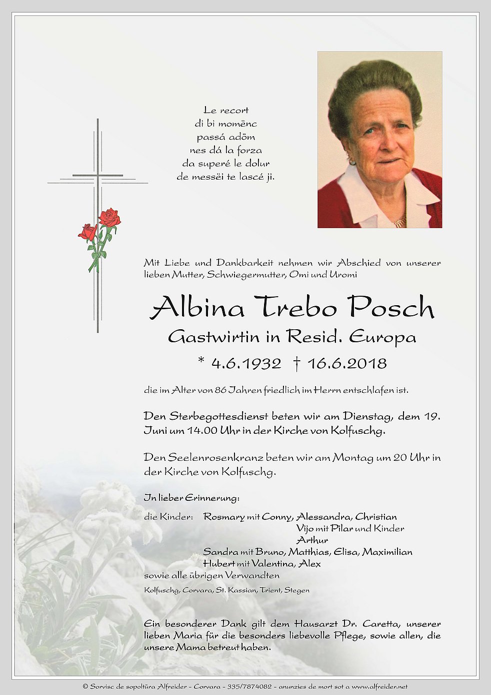 Den Sterbegottesdienst beten wir am Dienstag, dem 19. Iuni um 14.00 Uhr in der Kirche von Kolfuschg.