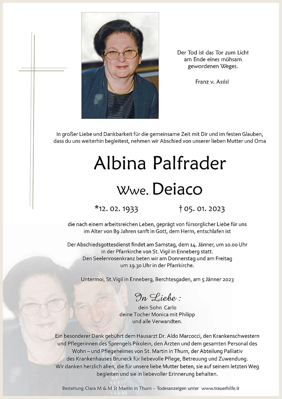 Ein besonderer Dank gebührt dem Hausarzt Dr. Aldo Marcocci, den Krankenschwestern und Pflegerinnen des Sprengels Pikolein, den Ärzten und dem gesamten Personal des Wohn – und Pflegeheimes von St. Martin in Thurn, der Abteilung Palliativ des Krankenhauses Bruneck für liebevolle Pflege, Betreuung und Zuwendung.