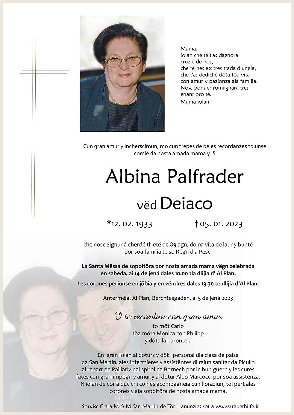 Der Abschiedsgottesdienst findet am Samstag, dem 14. Jänner, um 10.00 Uhr in der Pfarrkirche von St. Vigil in Enneberg statt.