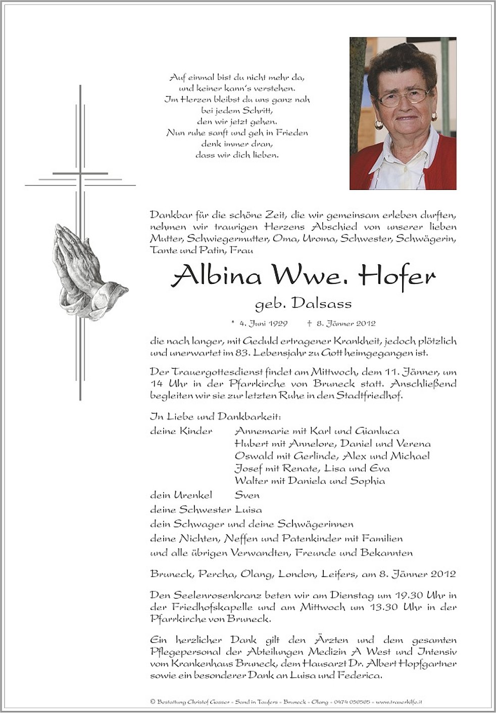 Der Trauergottesdienst findet am Mittwoch, dem 11. Jänner, um 14 Uhr in der Pfarrkirche von Bruneck statt. Anschließend begleiten wir sie zur letzten Ruhe in den Stadtfriedhof.
