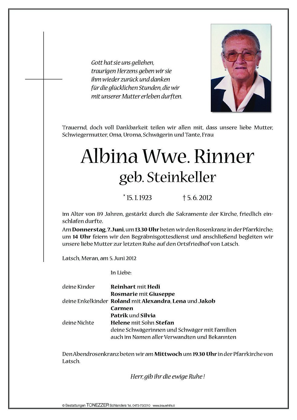 Am Donnerstag, 7. Juni, um 13.30 Uhr beten wir den Rosenkranz in der Pfarrkirche; um 14 Uhr feiern wir den Begräbnisgottesdienst und anschließend begleiten wir unsere liebe Mutter zur letzten Ruhe auf den Ortsfriedhof von Latsch.