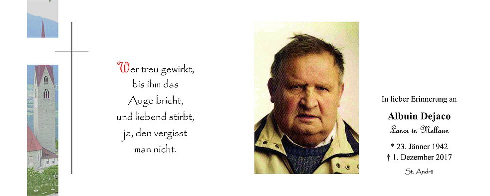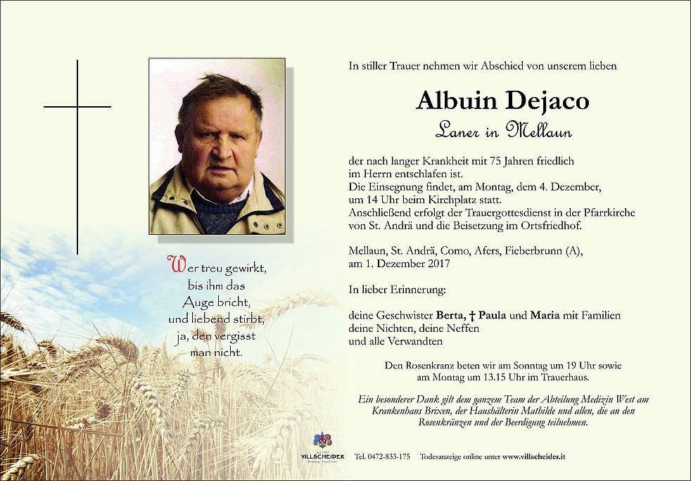 Ein besonderer Dank gilt dem ganzem Team der Abteilung Medizin West am Krankenhaus Brixen, der Haushälterin Mathilde und allen, die an den Rosenkränzen und der Beerdigung teilnehmen.