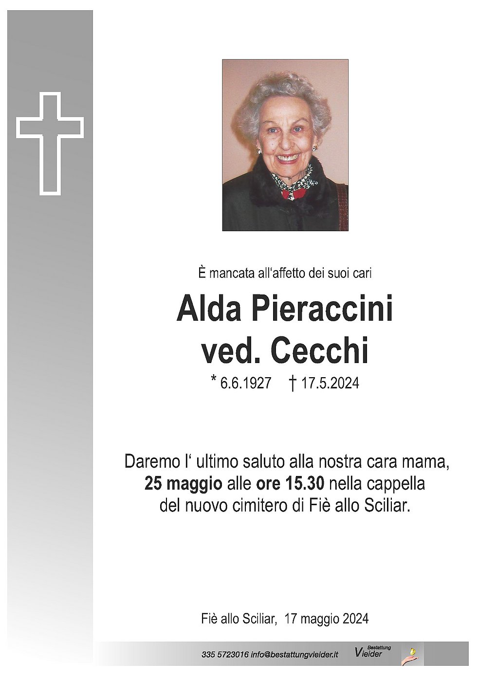 Urnenbeisetzung: 25.05. - 15:30 Uhr Friedhofskapelle Völs am Schlern