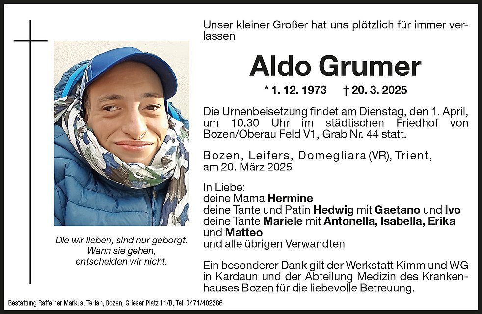 Die Urnenbeisetzung findet am Dienstag, den 1. April, um 10.30 Uhr im städtischen Friedhof von Bozen/Oberau Feld V1, Grab Nr. 44 statt.
