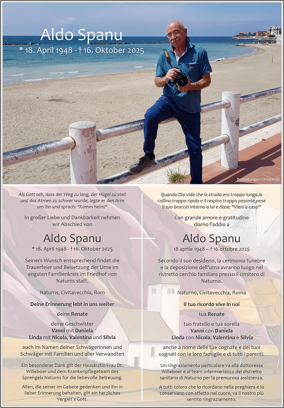 Seinem Wunsch entsprechend findet die Trauerfeier und Beisetzung der Urne im engsten Familienkreis im Friedhof von Naturns statt.